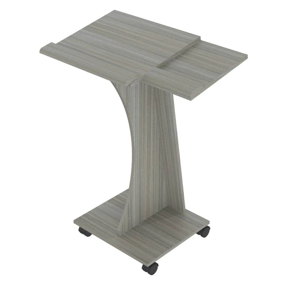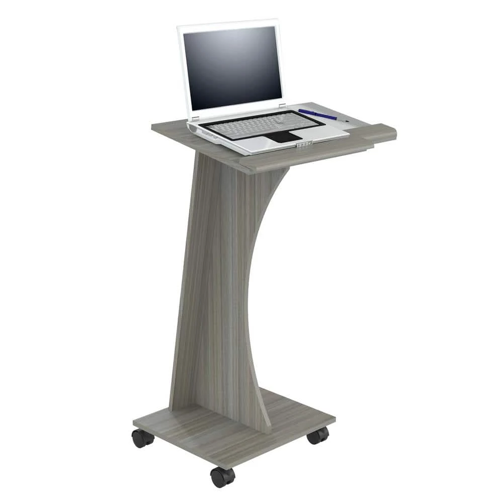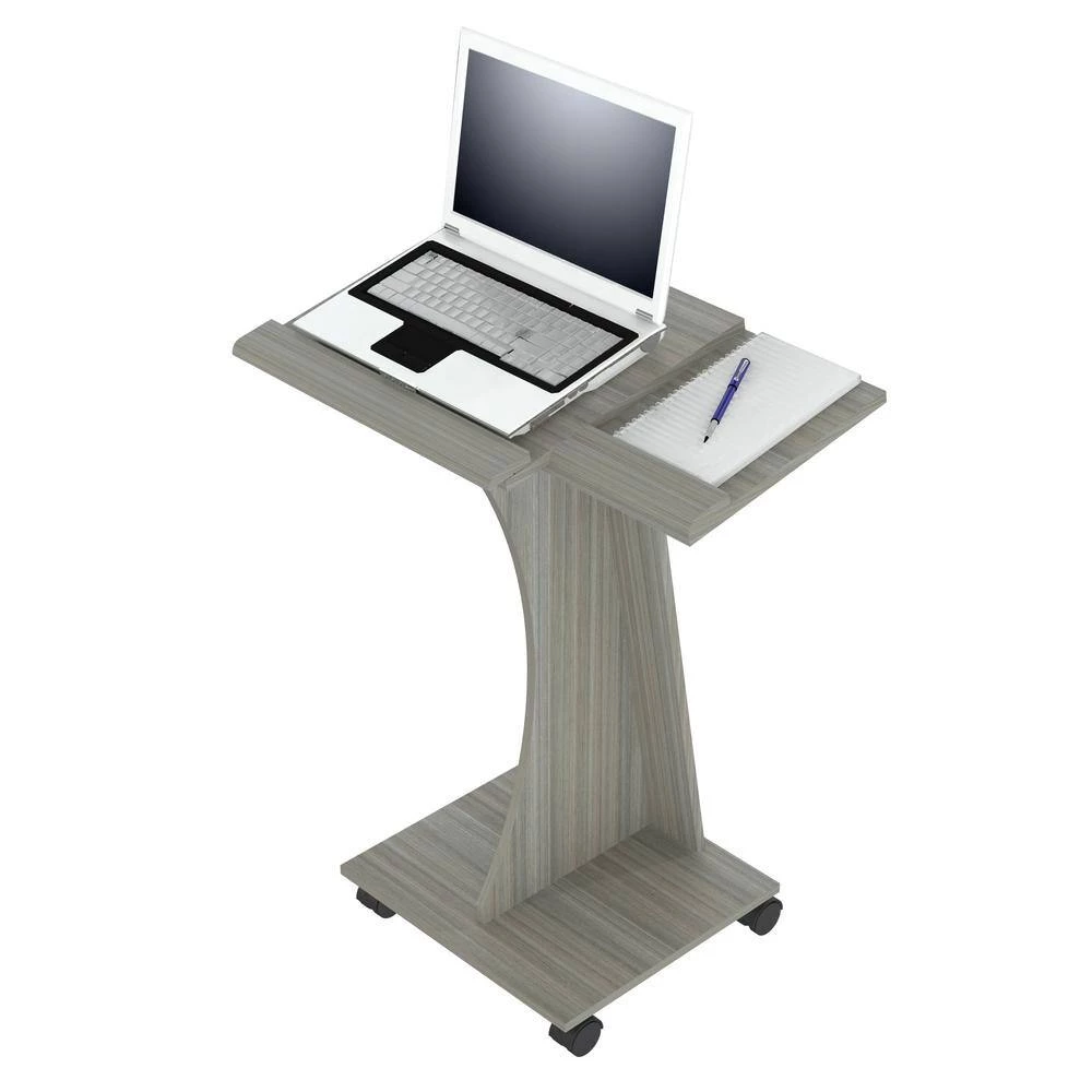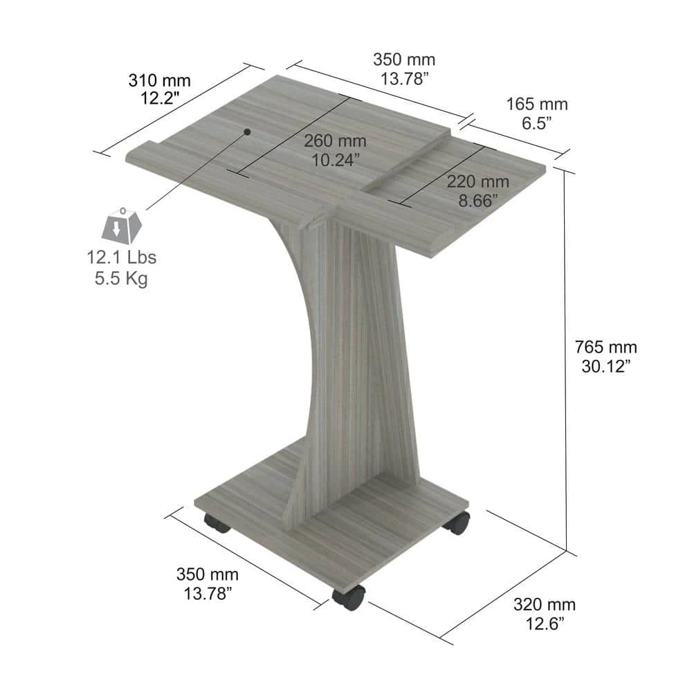 Rolling Laptop Cart finished in a rich Smoke Oak laminates in durable melamine which is stain, heat and scratch resistant. Constructed from manufactured wood. This unit has a functional modern design and is an excellent choice for any home office or office. It sits on four casters for easy mobility, which lock to secure the laptop card in place. It has two separate work surfaces and can be assembled for use with the mouse on left or right surface. Weight capacity 12.1 Lbs.