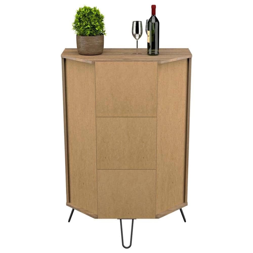 Retro Corner Multi-Functional Cabinet by Inval finished in a rich “Amaretto” laminate. This unit has a retro quality appearance with black metal handles and hairpin legs that will inspire your home decor. The center of the cabinet features an open storage shelf as well as a unique drop down door that converts concealed storage to an open display shelf. There are also 2 handy drawers to store smaller accessory items. The left and right sides of the cabinet feature a tall door concealing an ample storage area with 3 shelves, 2 that are height adjustable. Constructed from manufactured wood laminated on both sides with durable melamine which is stain, heat and scratch resistant. Assembly is Required.