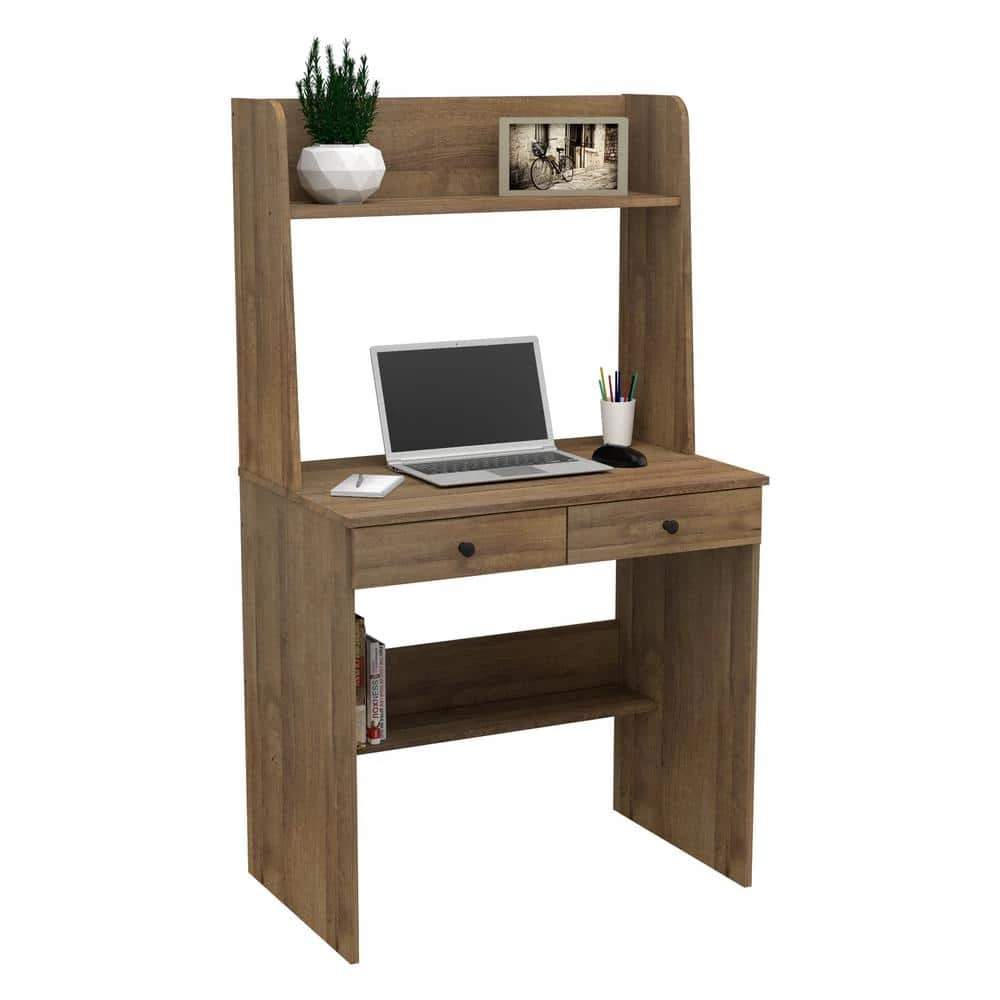 Computer Work center w/Hutch by Inval finished in a rich “Amaretto” laminates. This unit offers an ample work surface and open storage area. The hutch provides ample space for storage. For additional supplies, there are two box drawers with metal slides with brushed metal handles. Constructed from manufactured wood, laminated on both sides with durable melamine which is stain, heat and scratch resistant. Assembly required.