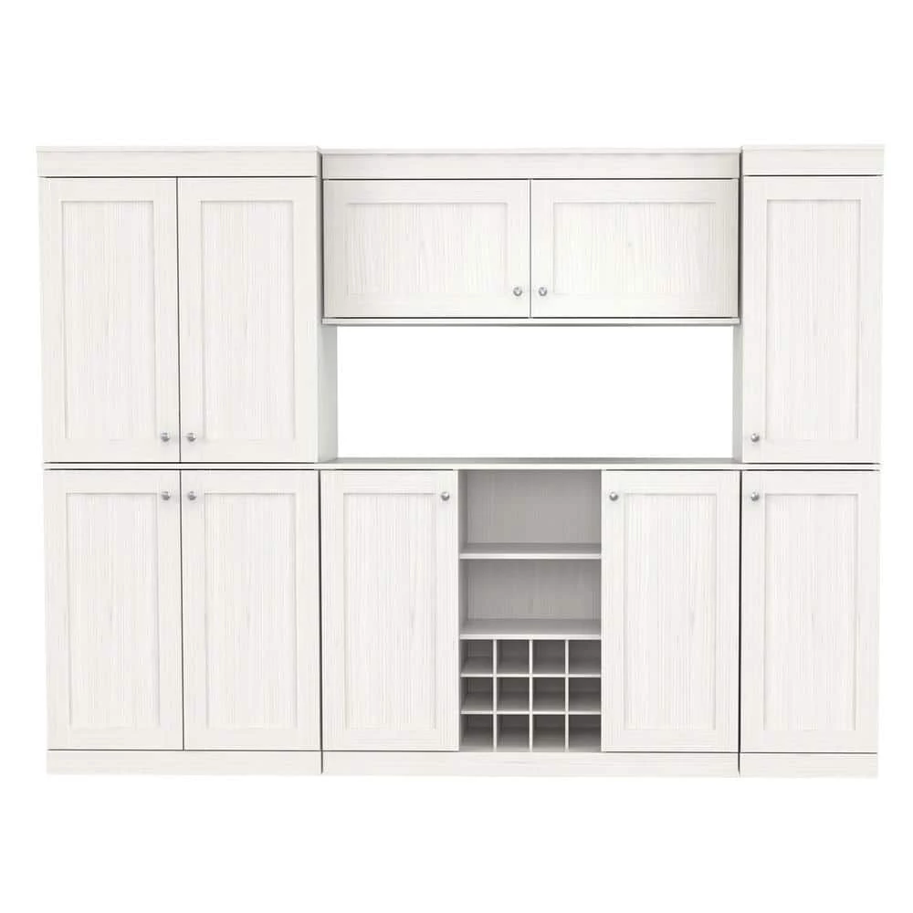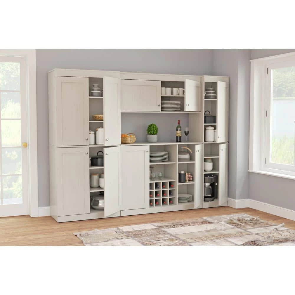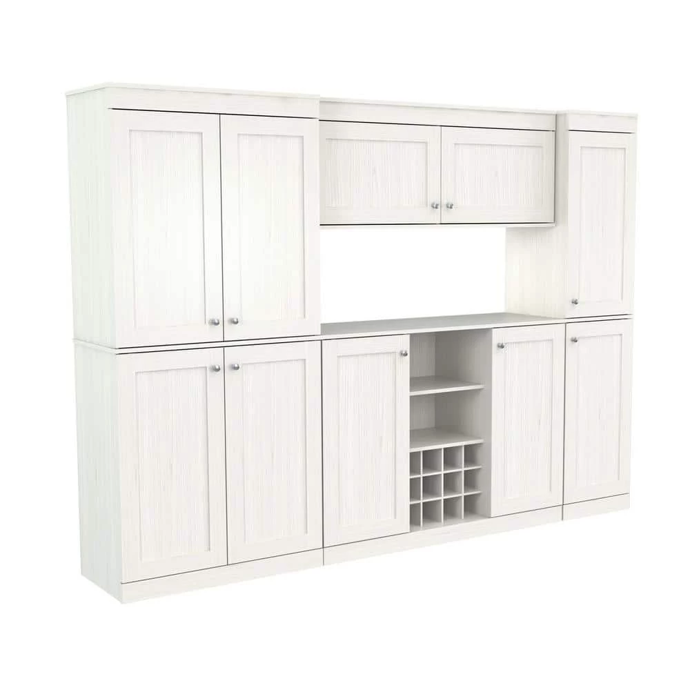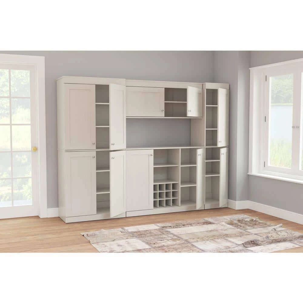 SHAKER STYLE Four (4) Piece Buffet Storage System finished in a rich Washed Oak laminate with durable melamine which is stain, heat and scratch resistant. This system is constructed from manufactured wood and features a functional modern design that is an excellent choice for your home. It includes a two (2) tall slim two (2) door cabinets, a two (2) door wall mounted cabinet and a two (2) slim door cabinet featuring European style concealed hinges and embellished with brushed metal handles. Interior adjustable shelves offer ample storage space. The center features a wine rack that can accommodate up to twelve (12) standard size bottles with top shelves for your glasses, ice bucket and other entertainment accessories. This cabinet is just the right size to provide additional storage and blend right in with your current entertainment decor. Anti-tip hardware is included. Assembly is required.