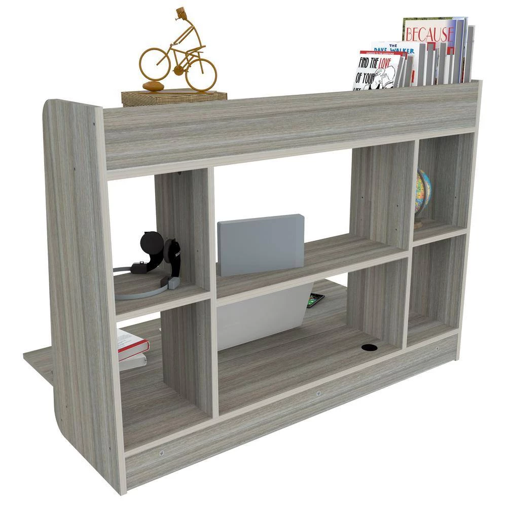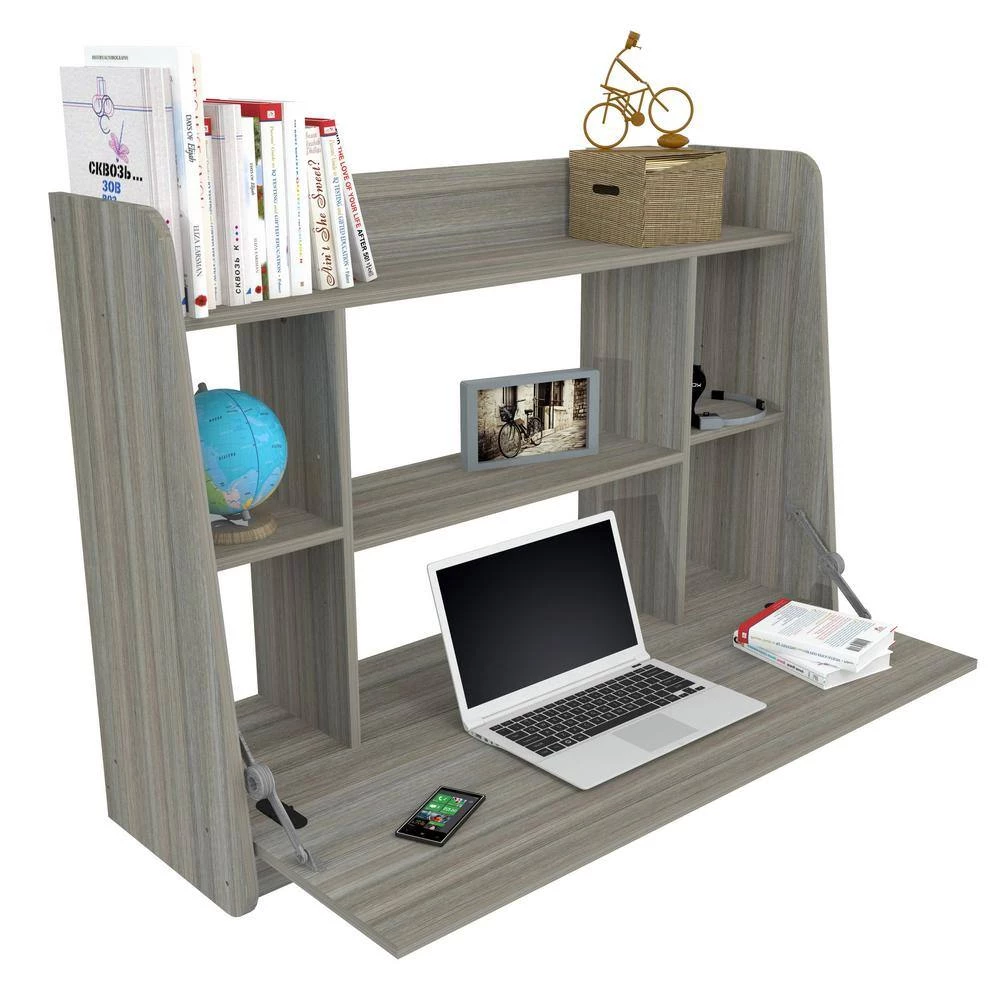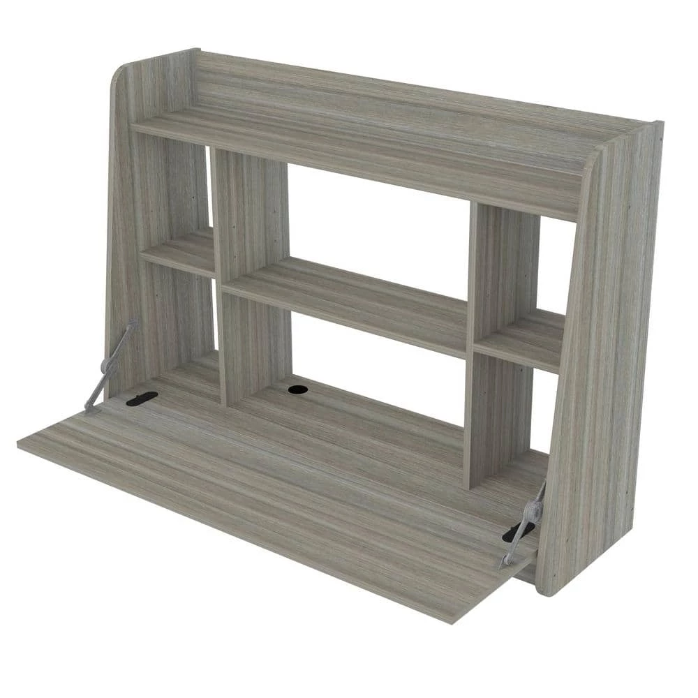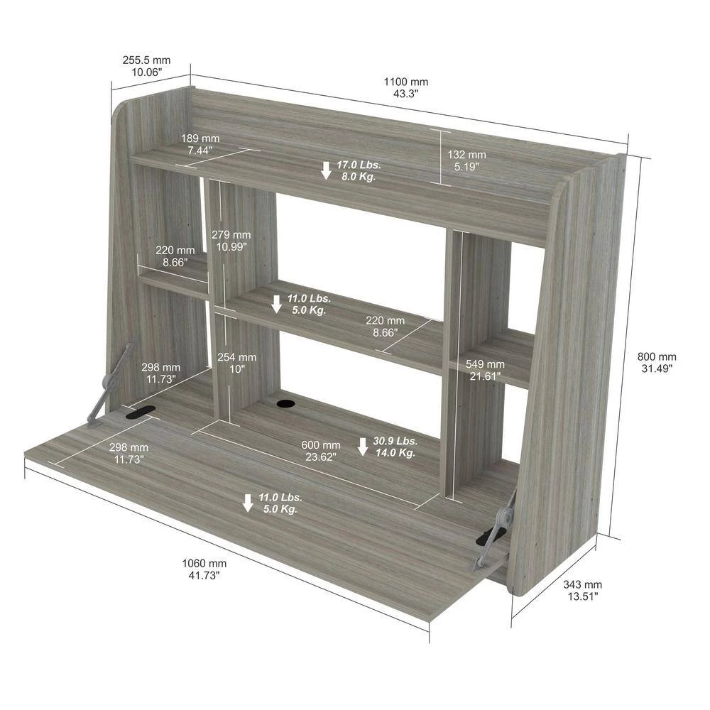 Inval Wall Mounted Floating Desk finished in a rich “Smoke Oak” laminates in durable melamine which is stain, heat and scratch resistant and is constructed from manufactured wood. This fashionable desk is the ideal remedy for your home or office compact desk needs. It features a fold down desktop with plenty of room for your laptop and other desk accessories. Six various size shelves which deliver lots of storage space for books, files, picture frames, and other decor accessories. At the end of the day the desktop folds into the wall mounted floating unit converting it into a wall unit for displaying your decoration Chair, laptop and decorative accessories are sold separately and not available through Inval. Assembly and installation required.