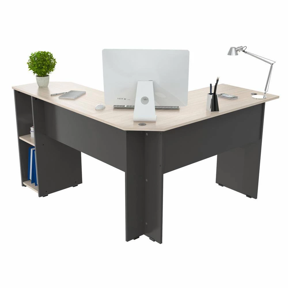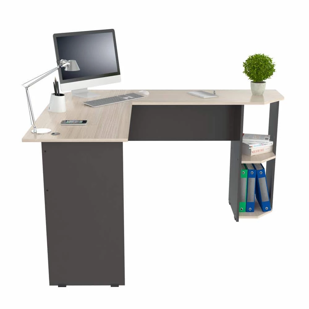 Merlin L Shaped Work Center by Inval finished in a rich “Dark Gray-Maple” laminates in durable melamine which is stain, heat and scratch resistant. Constructed from manufactured wood. With large dual desktops, you have an abundance of room on which to place your laptop, tablet, documents, office supplies and any other decor to add a personal touch. It has an open cubicle space with 2-shelves. The desk is equipped with a cable management pass-through to keep all cords organized. The design without center obstacles makes it simple to move from side to side enabling you to work in an effortlessly manner. Both the laminates and design make it ideal for staging and decorating your home office or office.