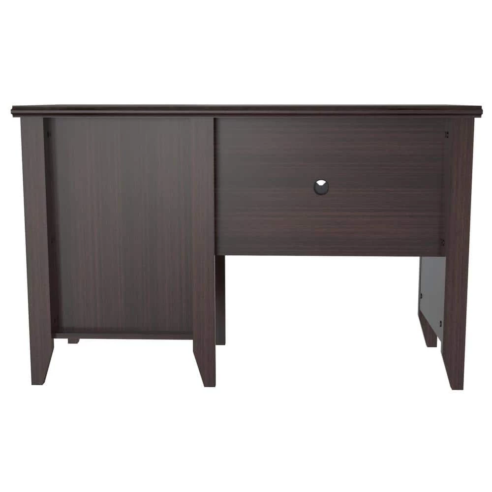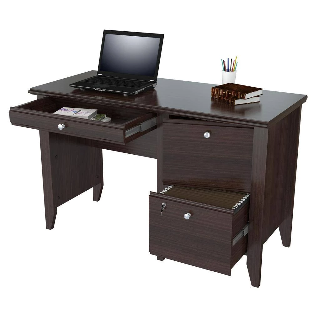 The Sherbrook Computer-Writing Desk by INVAL is an excellent selection for your small office or home office. Its elegant appearance and steady construction adds to its reliability. This computer table has a modest yet steady structure that enhances its dependability. The contemporary style of the table blends in with most room decors. The computer desk is constructed from manufactured wood in Espresso melamine laminate which is stain, heat and scratch resistant. This desk showcases an ample 1 in. (2.5 cm) thick Soft Form top laminated on both sides making it ideal for your laptop, tablets, and other office or home office essentials. It also includes a Soft Form bottom drawer with full metal extension slides that can accommodate letter sized hanging files and a lock and key for added privacy, a Soft Form top storage area with a door mounted with concealed euro hinges and a center pencil drawer to house your pens, notepads and other office basics. The desk has a double laminated modesty panel with cable management pass through.