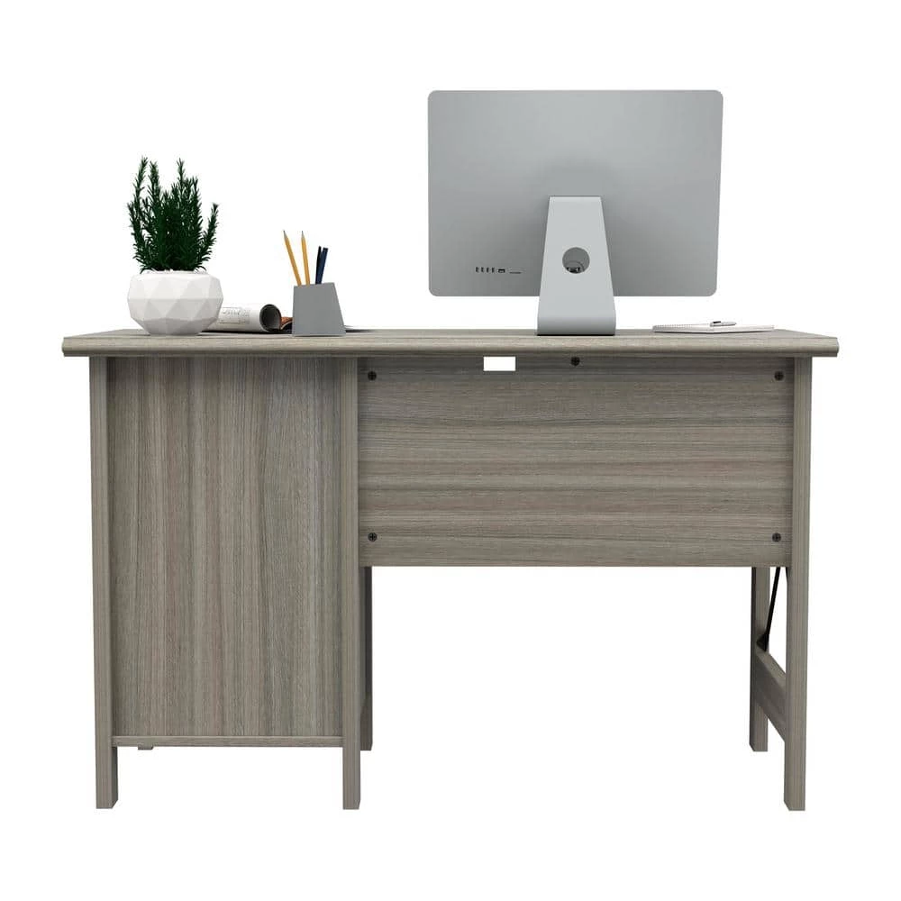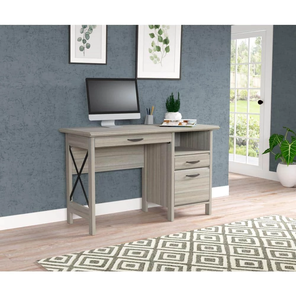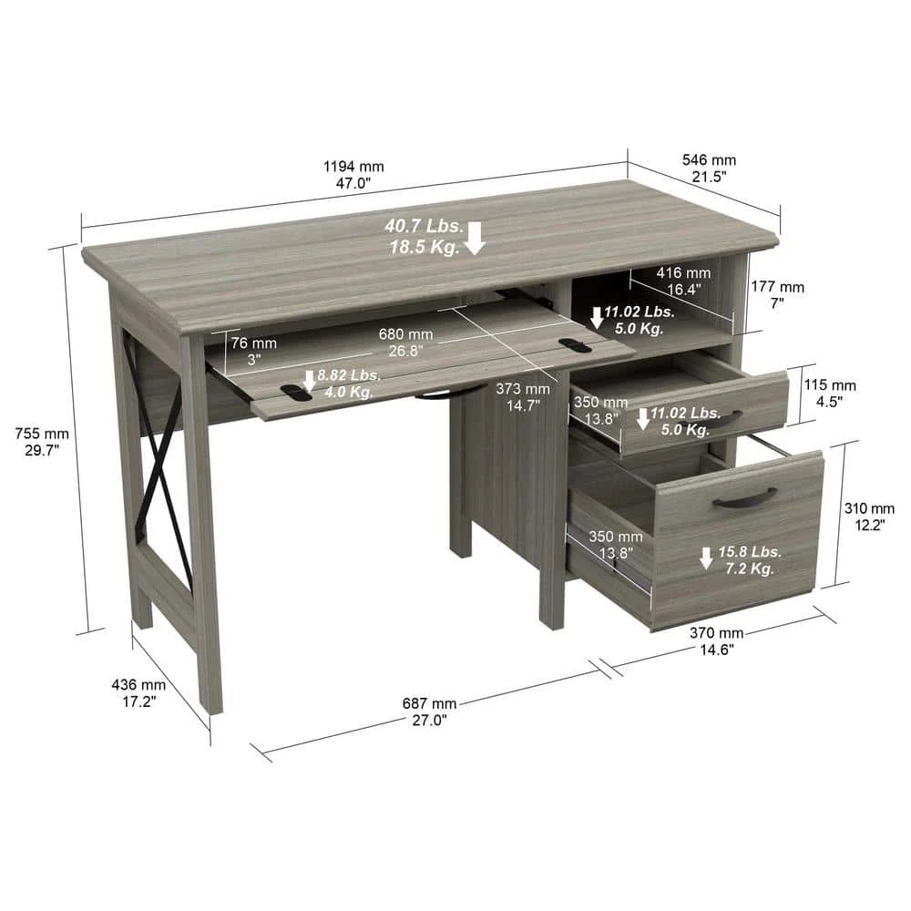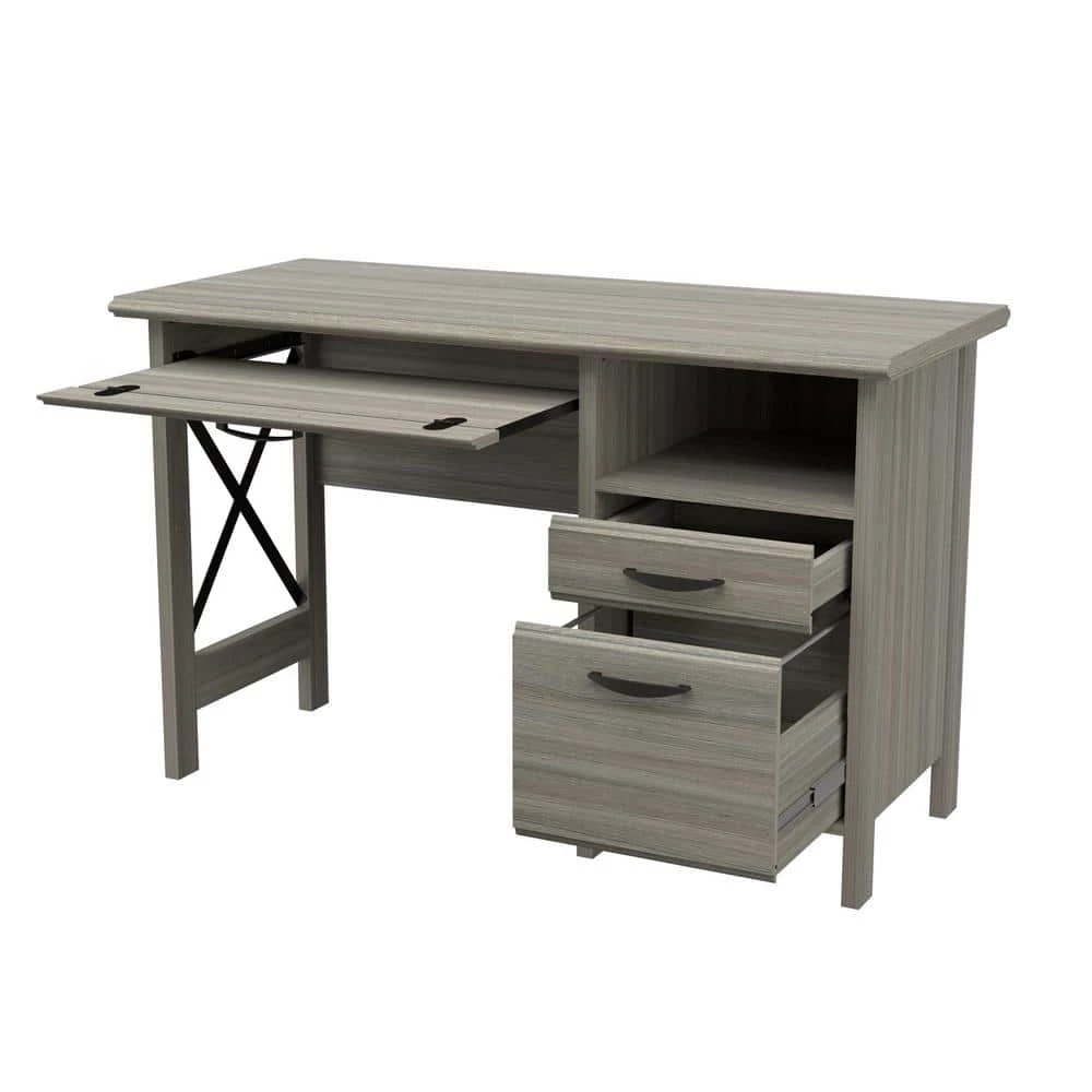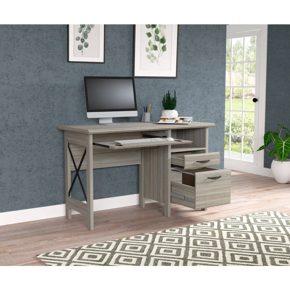Computer Desk by Inval finished in rich “Smoke Oak” laminate. This desk is perfect for your home office or office. It includes a slide-out keyboard tray along with an open storage shelf, one (1) accessory drawer for extra storage and one file drawer will full extension slides that accommodates letter sized files. Modern wire design on one side. Constructed from manufactured wood laminated on both sides with durable melamine which is stain, heat and scratch resistant. Assembly required.