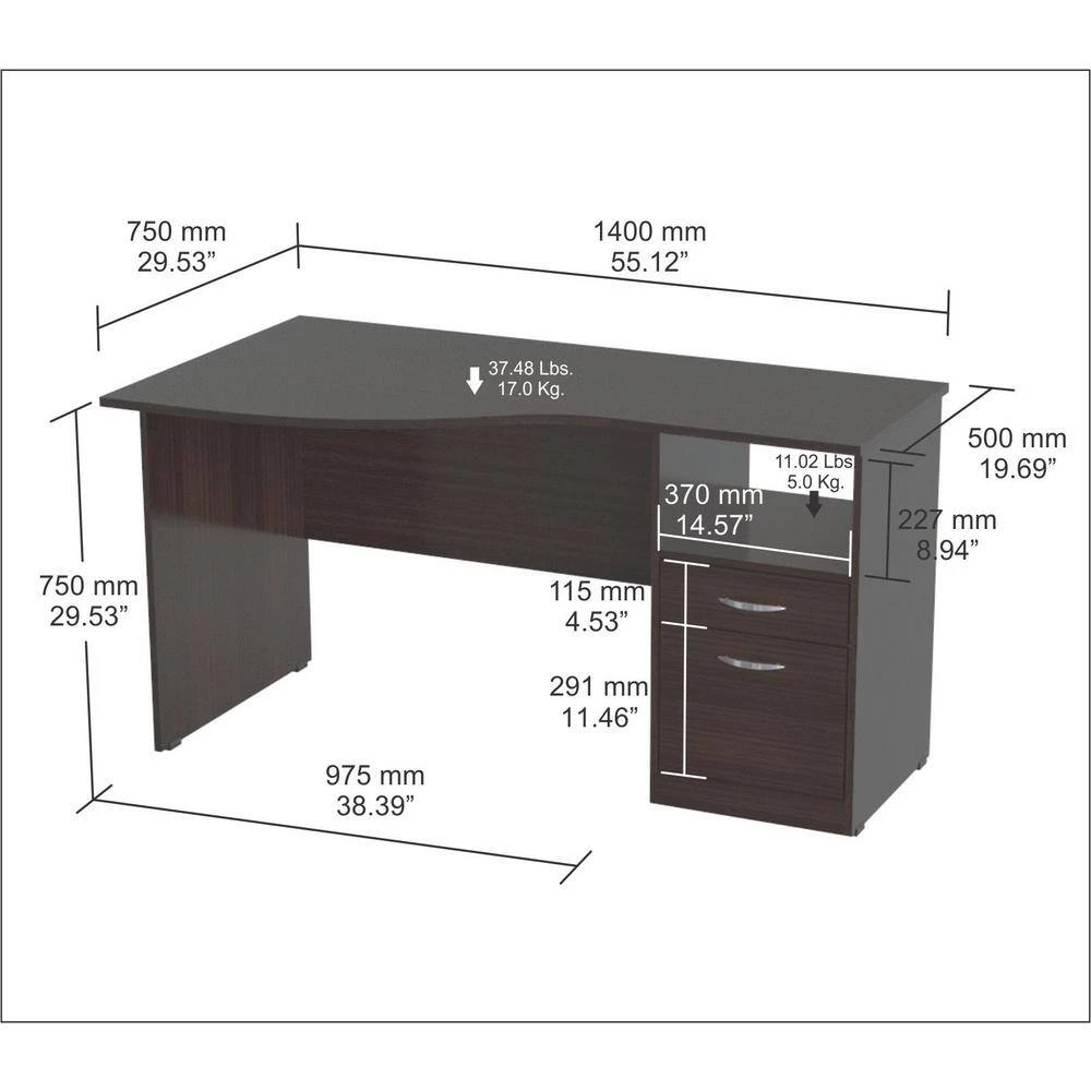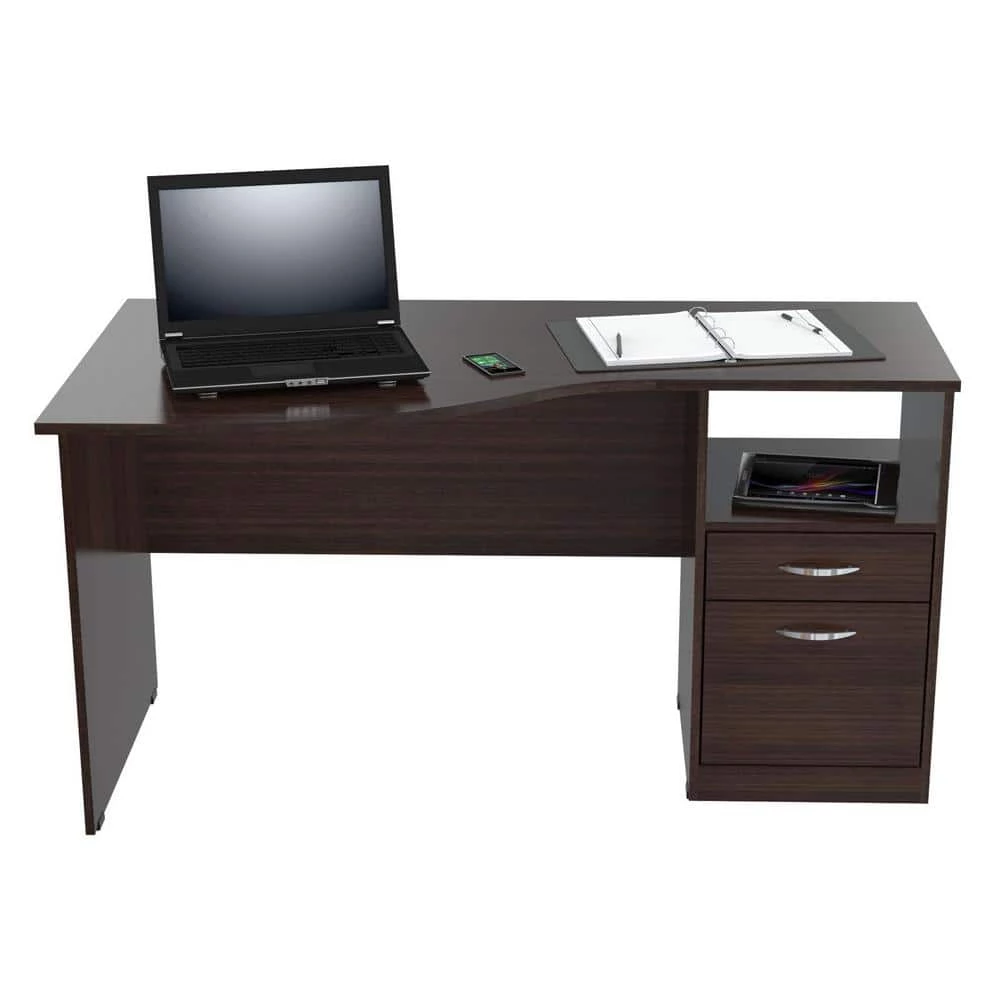 Inval Desk finished in Espresso-Wengue laminates. Executed in solid composite wood, double laminated durable melamine which is stain, heat and scratch resistant. This desk features a large curved top providing a spacious work surface which will create a perfect addition to your home office or office. It includes a laminated modesty panel, open storage shelf, one accessory drawer with slides, and one file drawer both with brushed metal handles. The file drawer has full extension slides which accommodates letter sized files. Square plastic sliders protect the unit and allow for easy mobility when cleaning or rearranging your room decor.