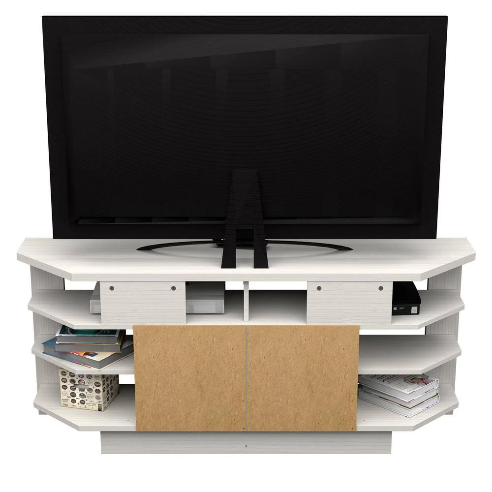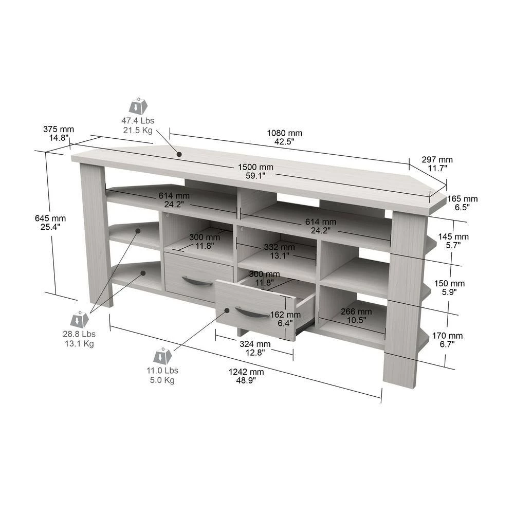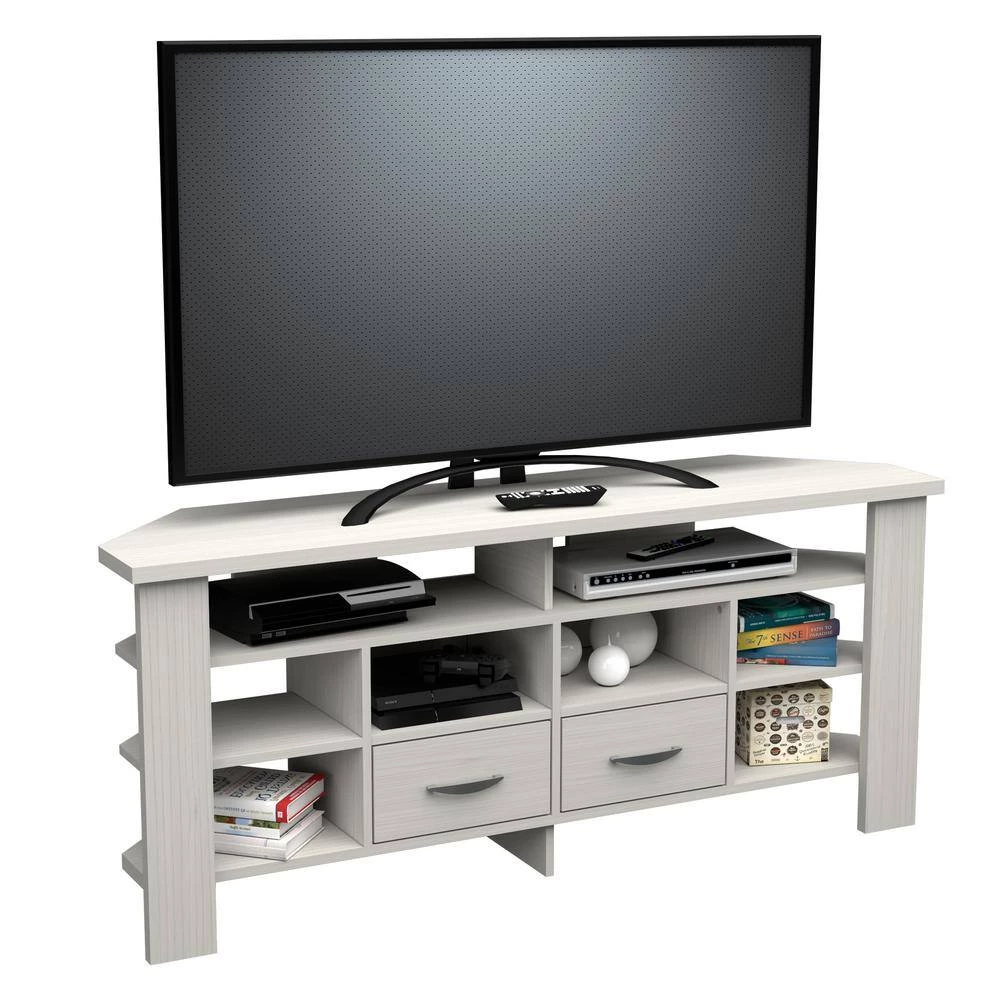 Corner TV Stand by Inval finished in a rich “Washed Oak” laminate. This modern designed TV stand has a very functional corner design to accent your home decor and make the most of your space. It accommodates up to 60 in. flat-screen TVs with a maximum TV weight of 50 lbs. This unit features open storage areas to showcase your A/V equipment and 2-storage drawers with brushed metal handles. Constructed from manufactured wood laminated on both sides with durable melamine which is stain, heat and scratch resistant. Assembly Required.