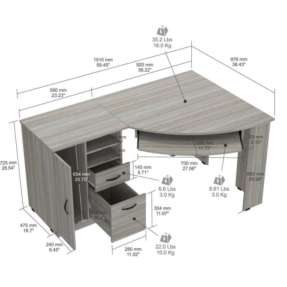 L Shaped Work center finished in a rich Smoke Oak laminate with durable melamine which is stain, heat and scratch resistant. It is constructed from manufactured wood. This corner computer desk has a large work surface making it a perfect addition to your home office or office. It is finished on all sides and features an open storage compartment, one (1) accessory drawer with a brushed metal handle and metal slides, as well as one file drawer with a brushed metal handle and full extension metal drawer glides. The file drawer can accommodate both letter and legal sized files. There is an ample CPU storage compartment positioned behind a door with brushed metal handle. Plastic sliders protect the unit and allow for easy mobility when cleaning or rearranging your room decor. Assembly is required.