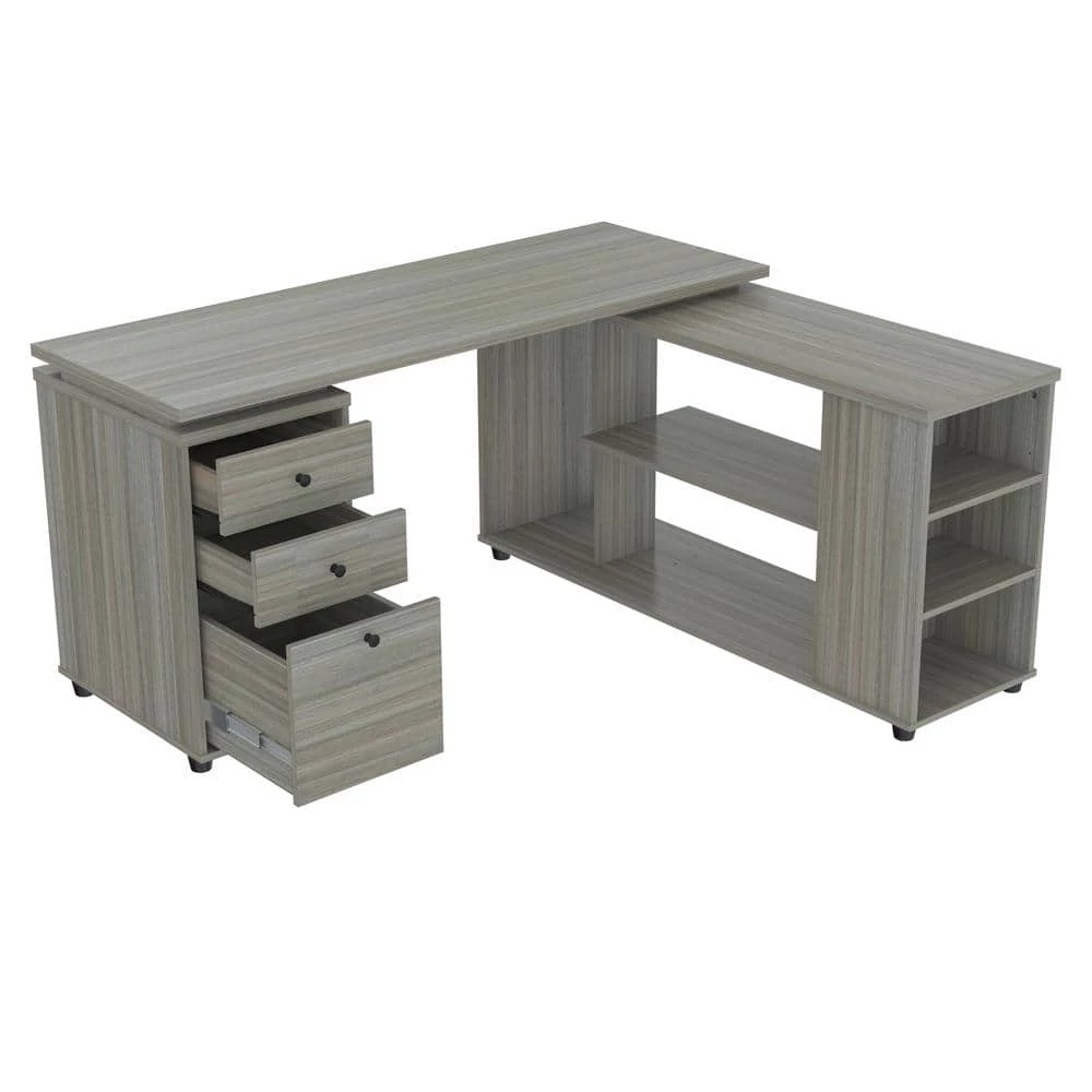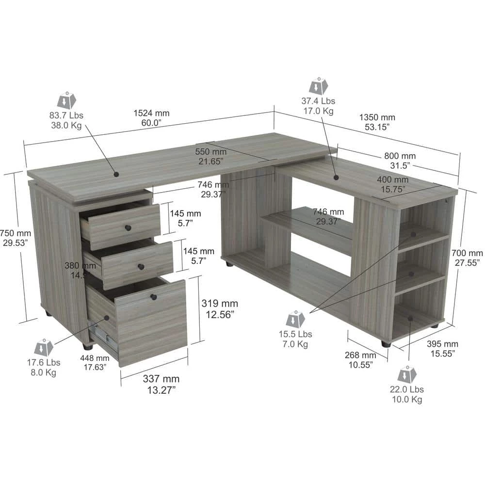 L-Shaped Computer Workstation finished in a rich Smoke Oak laminate with durable melamine which is stain, heat and scratch resistant. It is constructed from manufactured wood. This corner computer desk offers a spacious work surface making it a perfect addition to any home office or office. It has a 1 top with 1.5mm edge banding and it can be assembled in a left or right configuration. It features one (1) file drawer with full extension metal drawer glides which accommodates letter or legal sized files, and two (2) accessory drawers with brushed metal slides for storing supplies. All drawers have brushed metal knobs. The unit offers an ample work space, shelves for books, dedicated CPU storage, printer space and space for other accessories. Plastic sliders protect the unit and allow for easy mobility when cleaning or rearranging your room decor. Assembly is required.