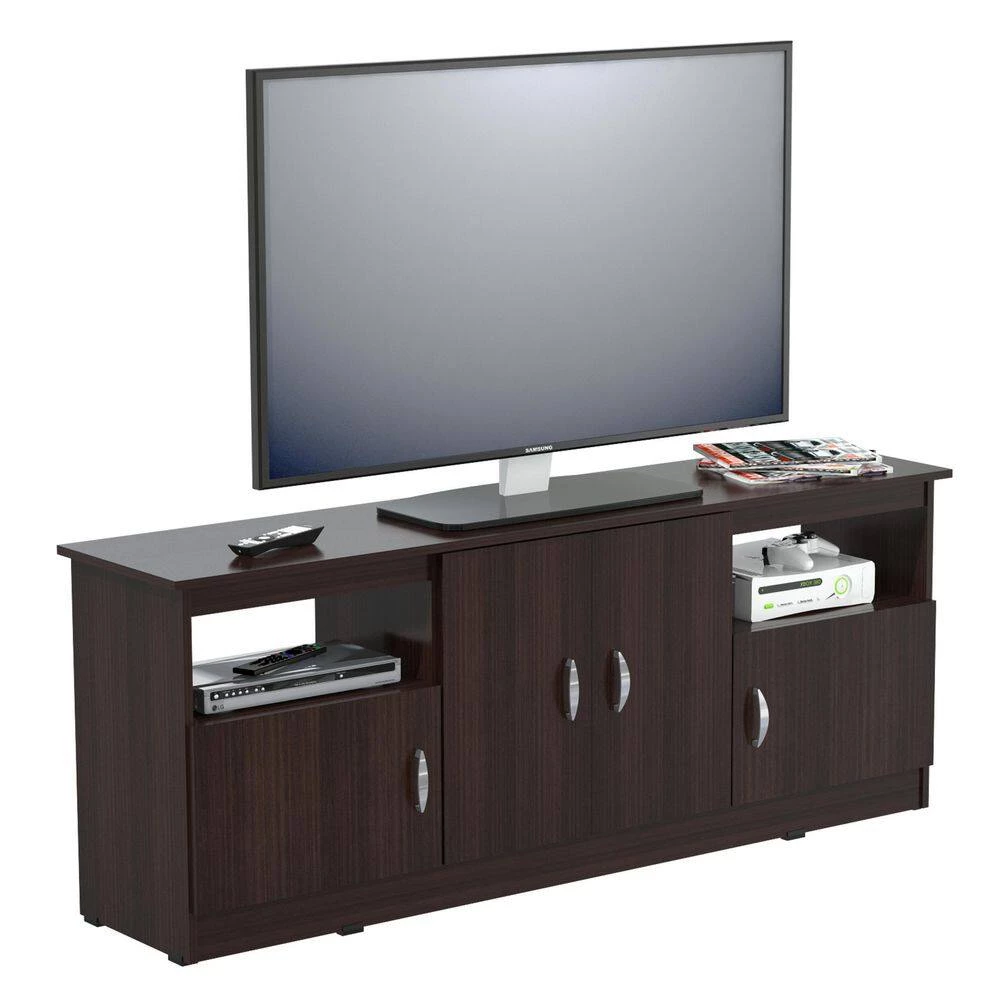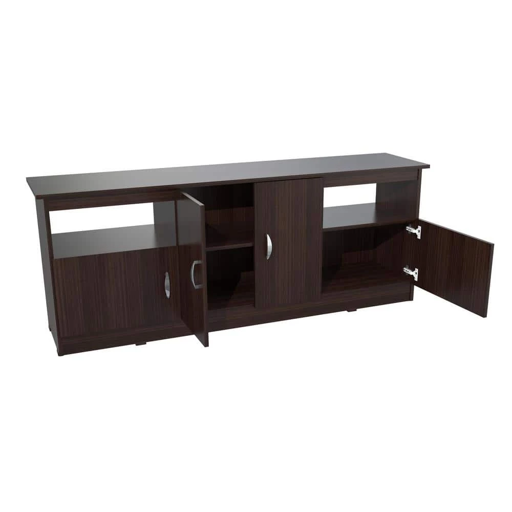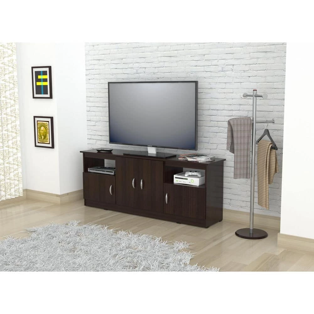 Inval TV Stand finished in rich Espresso-Wengue laminates. Executed in solid composite wood, double laminated durable melamine, which is stain, heat and scratch resistant. It has a very functional yet simple modern look to accent your home decor. The unit can accommodate up to 60 flat-screen TVs with a maximum TV weight of 78 lbs. The unit features concealed storage space behind a set of small doors and a set of large doors with brushed metal handles. Also available are 2 open storage compartments for additional storage or exhibition of your AV equipment. For your convenience, the back of the unit is also open for easy management cable pass through.