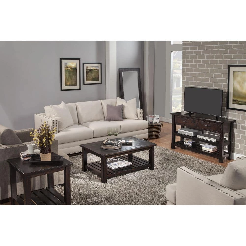The Barn Door Collection Console Table is a beautiful casual farmhouse/cottage styled table with a hint of a rustic touch. This console table is finished in an Espresso finish and constructed of solid New Zealand Radiata Pine with rough-hewn saw marks. Additional details include soft rounded corners on the top while the legs are beautifully detailed with chamfer cuts. Table has two drawers with ball bearing slides and custom finished drawer handles. The two (2) slatted bottom shelves further complement the tables farmhouse look while offering extra storage space. An additional design feature allows for up 12 standard 750 ml wine bottles to be safely stored between the slats on the bottom two shelves. The versatile design and look allow for the console table to be used in the living as a TV stand for TVs up to 50 in. or in the dining room as a server or buffet. Assembled product dimensions: 50 in. W x 16 in. D x 30 in. H. Product materials: Solid Wood – New Zealand Pine. Easy assembly – Top and drawer unit is pre-assembled, only needing to attach the legs and bottom shelf. Made in Vietnam.