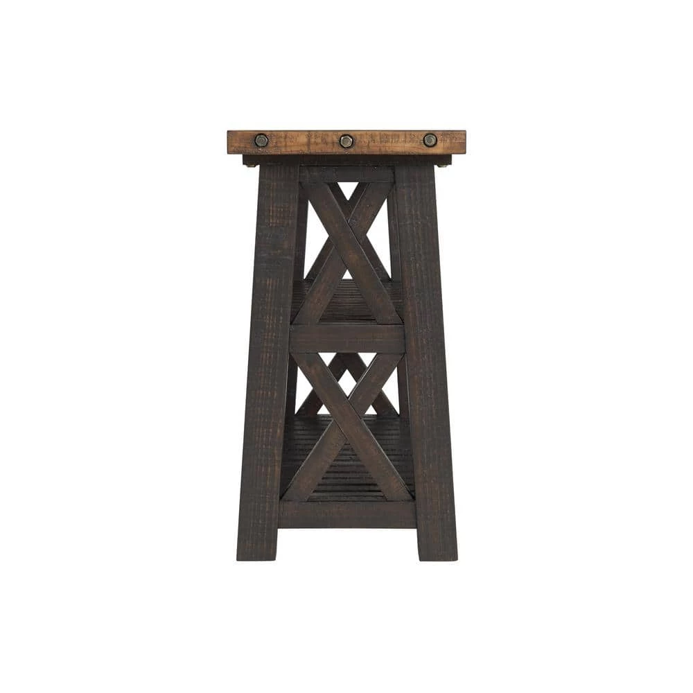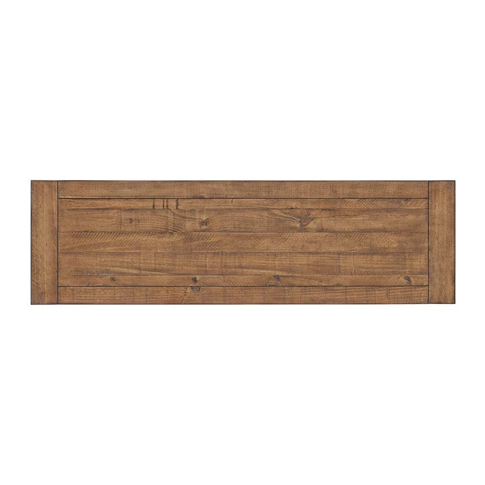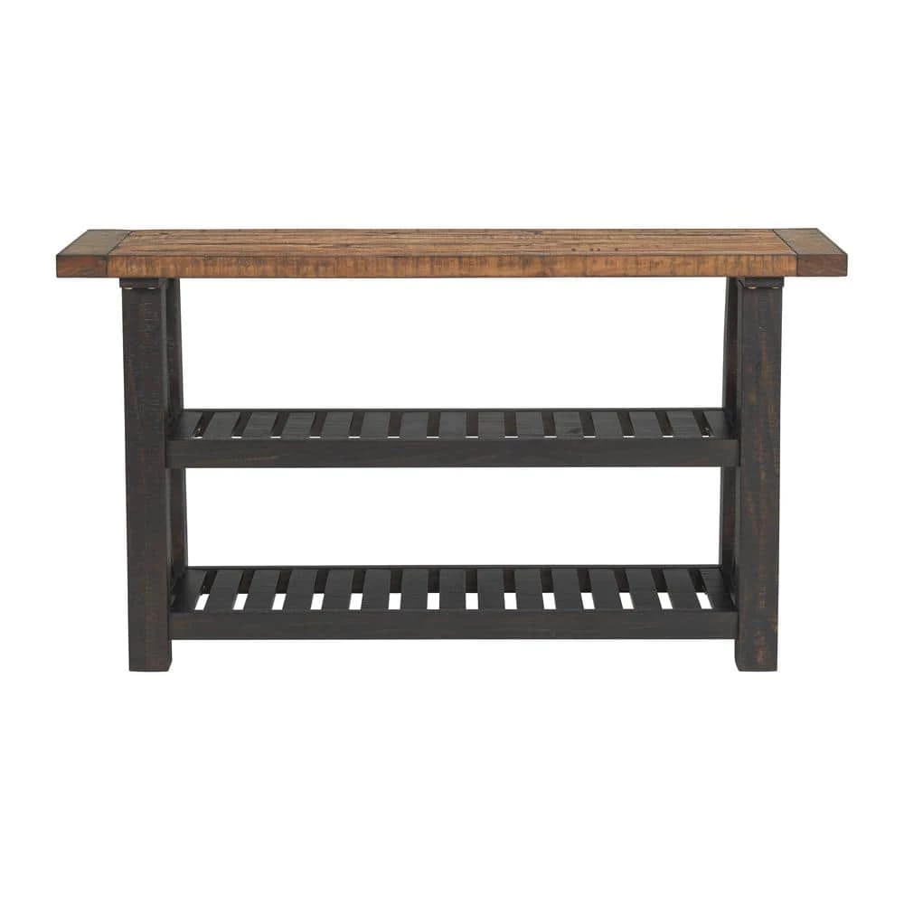 The Bolton Sofa Table offers an Industrial Rustic style to your living or family room. The table is constructed of solid New Zealand Pine and finished in a two-tone Black Stain base and Natural top. The industrial style is represented with four large dark aged brass finished industrial bolts that span across each end the top. The x-framed legs not only add to the look, but provide extra stability. The 1.5″ thick tops are detailed with a plank design purposeful distress marked details. Two shelves allow for plenty of storage space. The 55″ wide design allows for the table to also be used as a TV Stand or Console for TVs up to 60″ W.