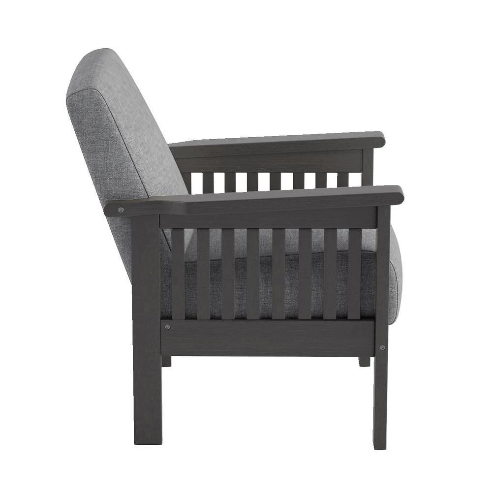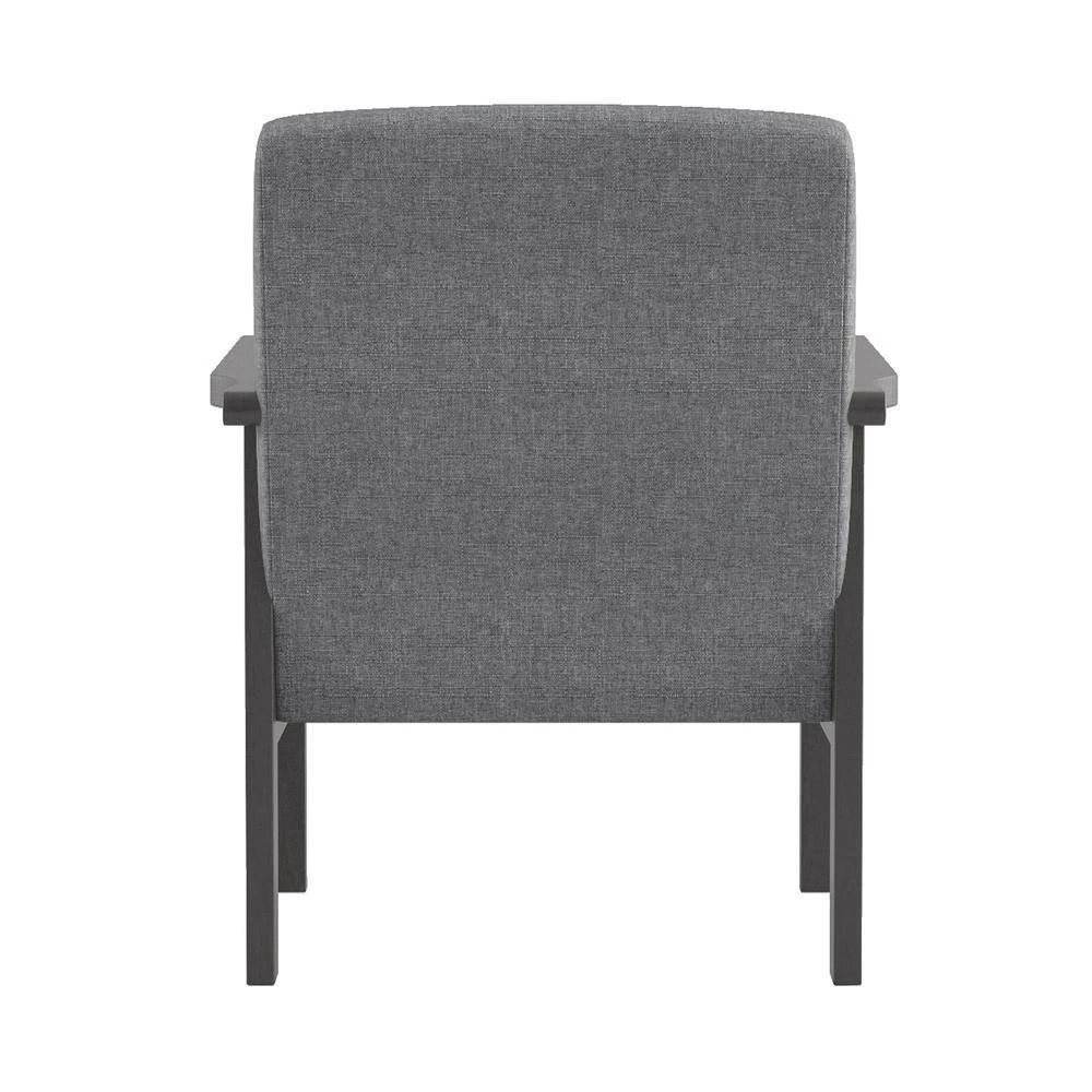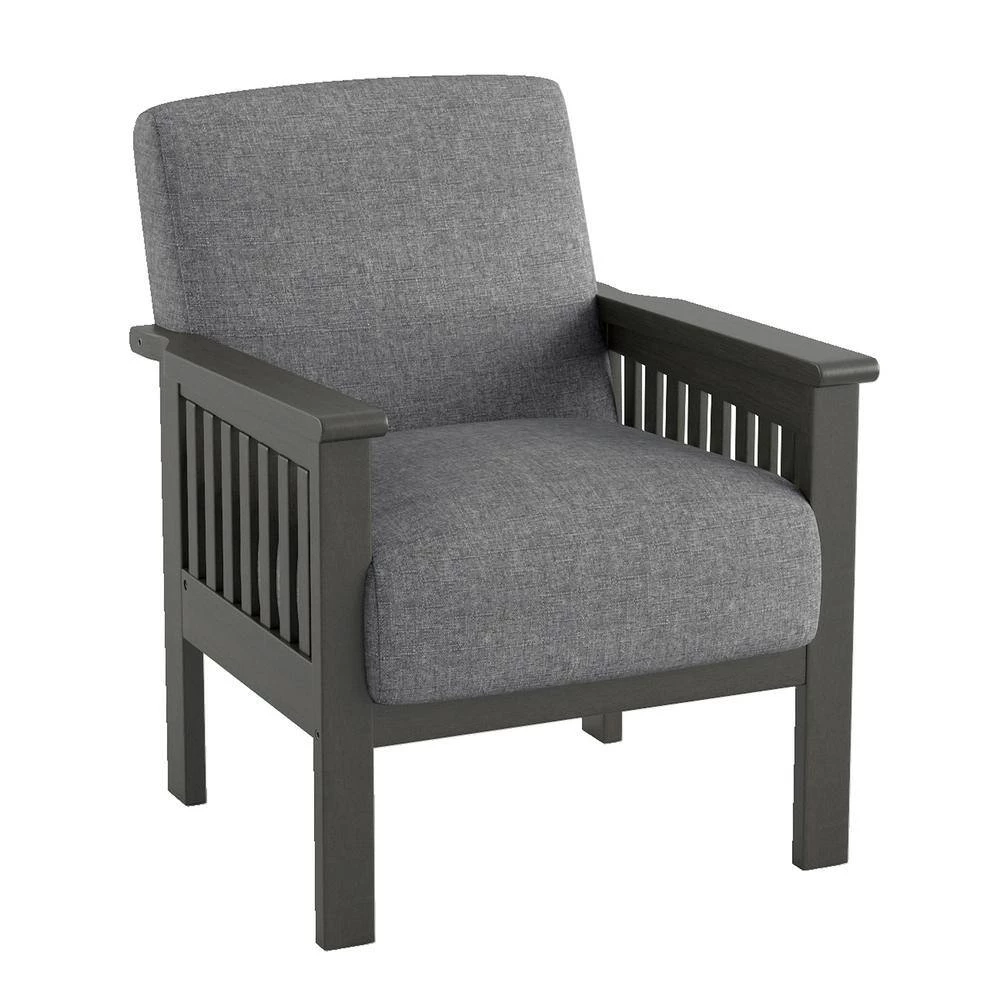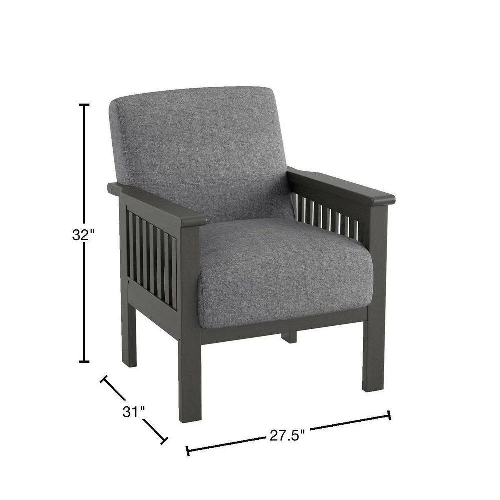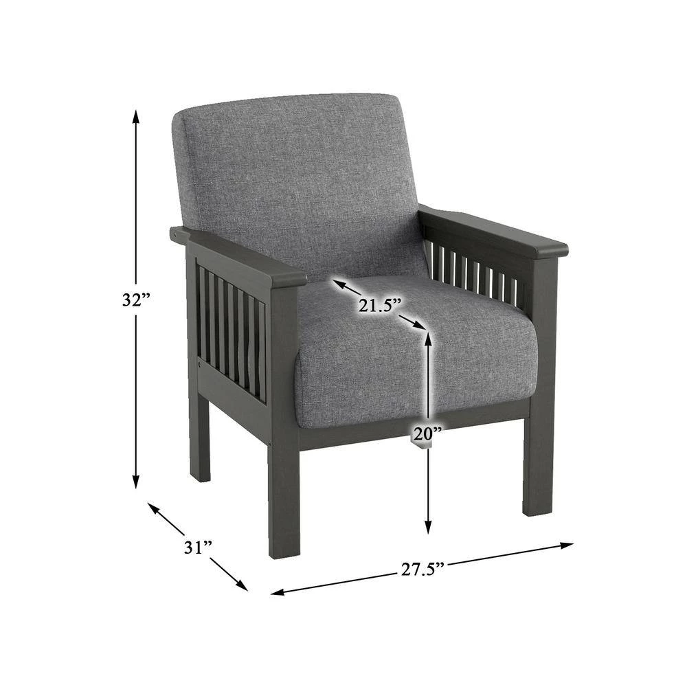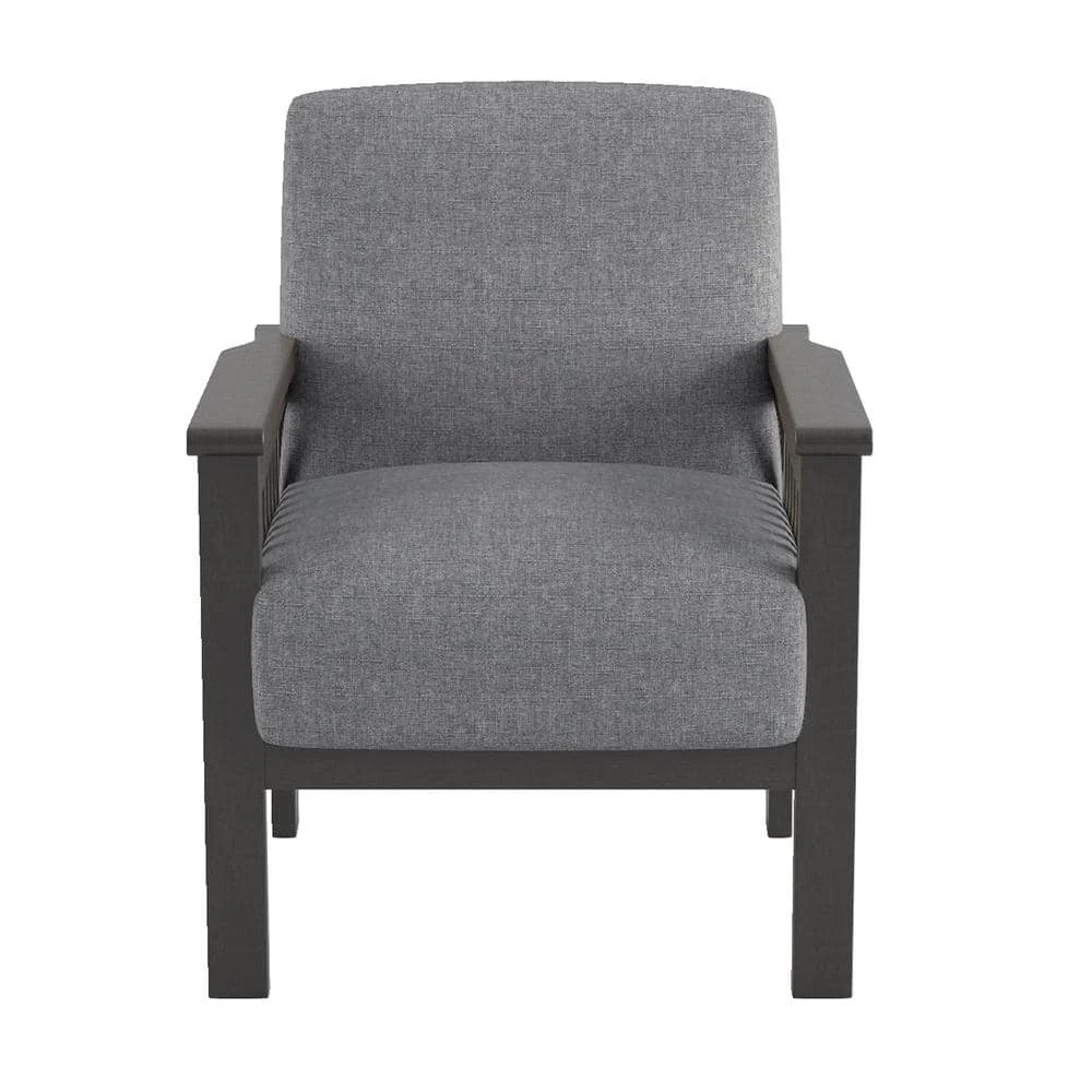 Designed with inspiration from the Arts & Crafts movement. The Copley Collection will be a classic addition to your home’s decor. The chair’s transitionally styled legs and vertical slat-supported wood arms are finished in an antique gray, providing complementing contrast to the multi-color fabric covering. Our accent chair looks great from all angles, whether in a lounge arrangement, public waiting area, or private office.