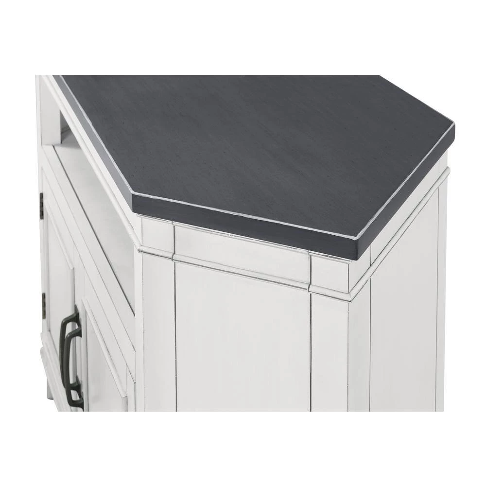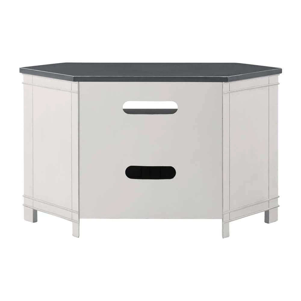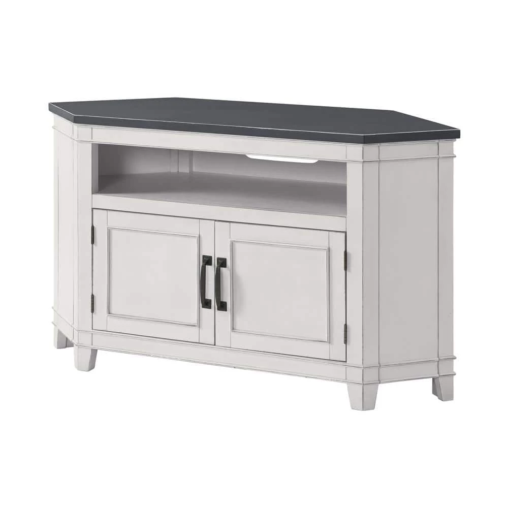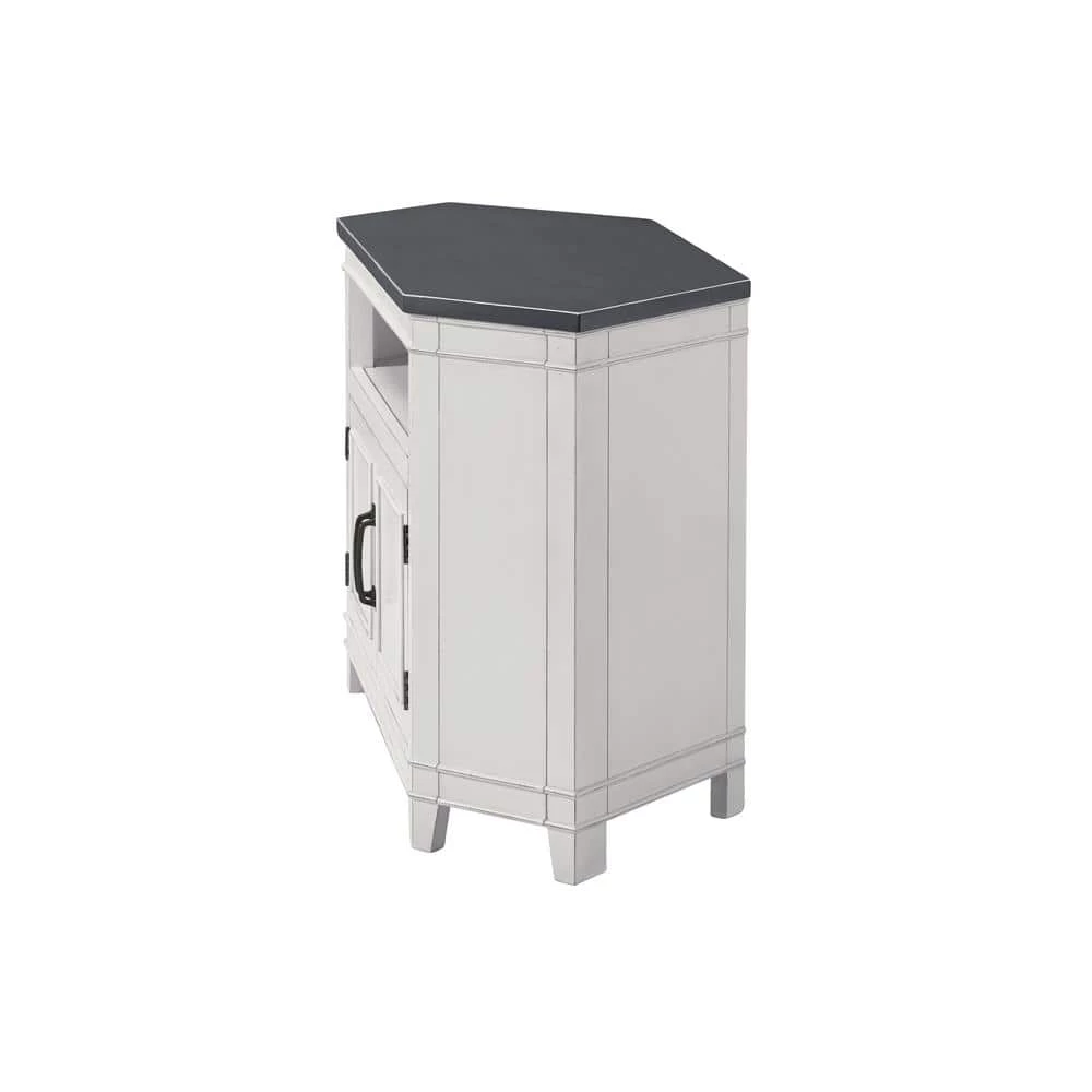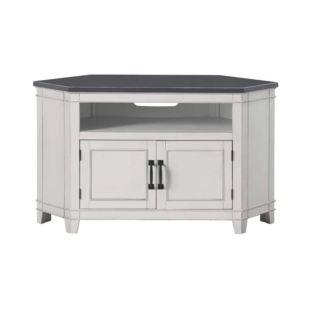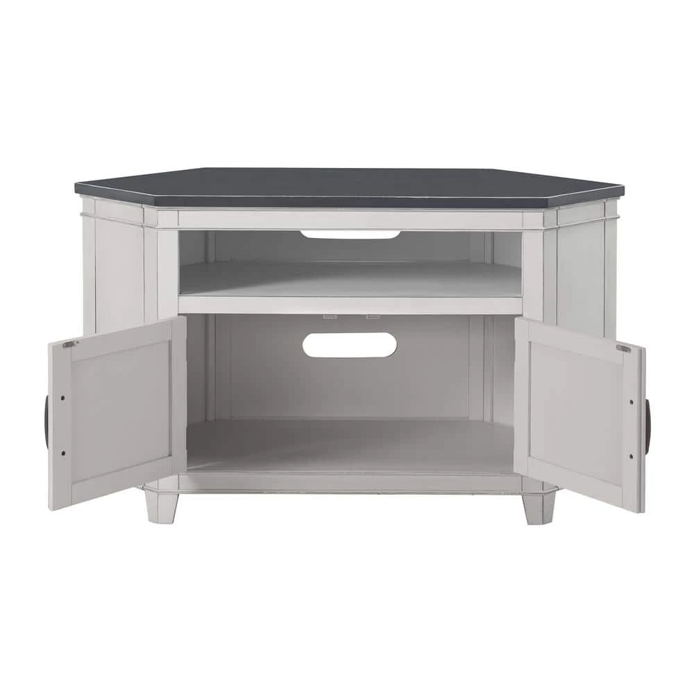 The Del Mar Corner TV Stand is designed to maximize space in the living room while not compromising on function and style. The Coastal Casual transitional styling features a hand painted style finish has just the right amount of aging and rub-through in a complementing White case and Grey tops with a slight white undertone. An open cubby spans across the TV Stand and offer plenty of room for cable box, gaming systems, or a sound bar. The large cabinet design provides for versatile storage options for additional audio, video, gaming components, or other belongings. Ideal for flat panel TVs up to 55 in., Antique pewter finished pulls on the doors lend a nice balance of style and functionality to the TV Console. Cable management access allows for airflow and clutter free storage. Features the Lightning Fast Assembly System which allows for easy and fast assembly. Anti-tip kit added for safety. Assembled Dimensions: 49.5 in. W x 29.5 in. H x 19 in. D. Approximate Open Cubby Dimensions: 30 in. W x 6 in. x 19 in. D. Approximate Cabinet Dimensions 30 in. W x 14 in. x 19 in. D.