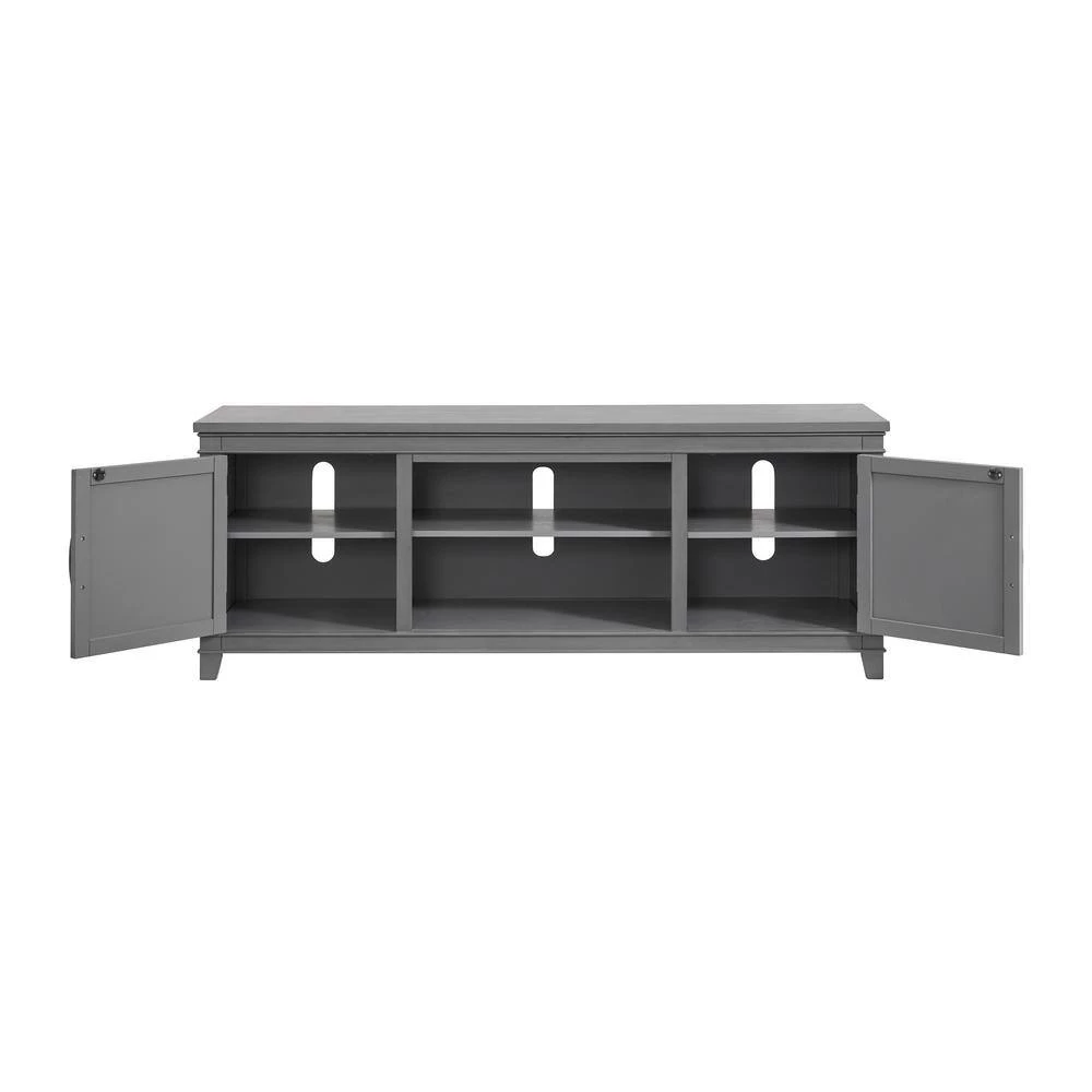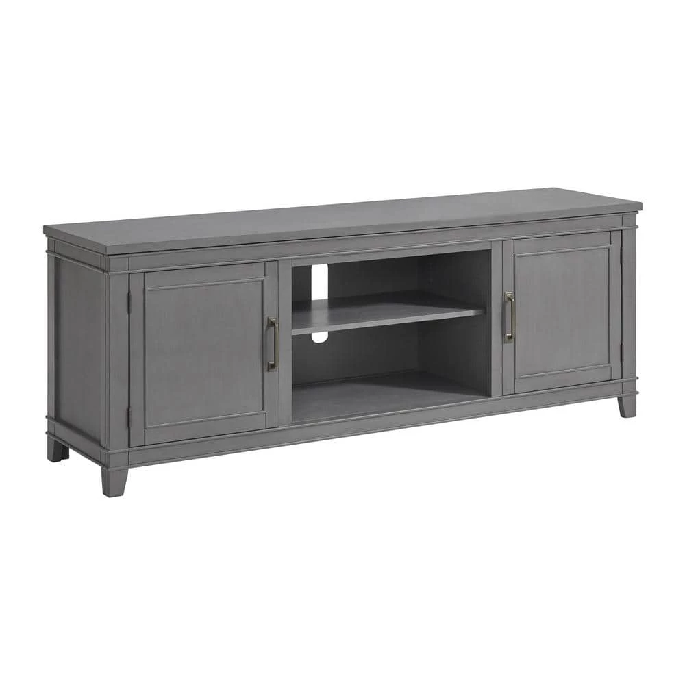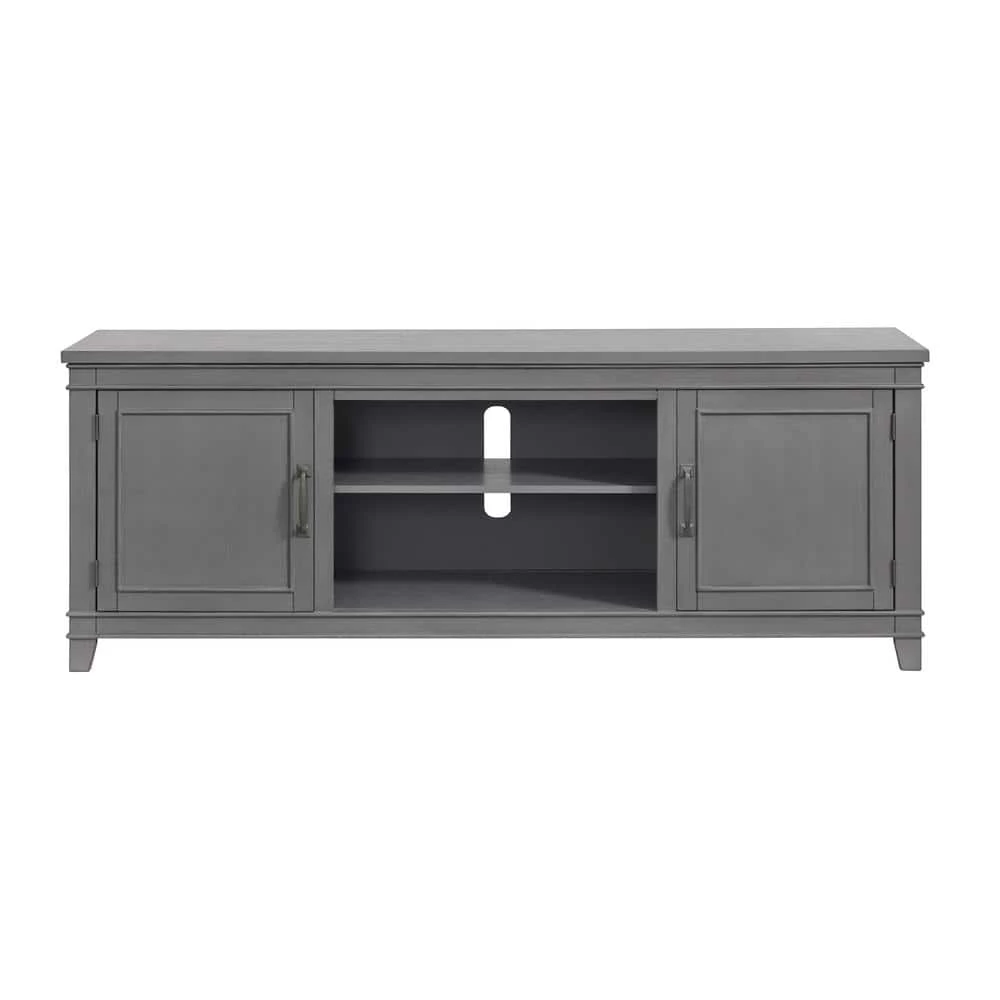 The Del Mar TV Stand offers in. Coastal Casual in. transitional styling to add style to your living room. The hand painted style finish has just the right amount of aging and rub-through in a complementing White. The 70 in. wide and 26 in. height design is perfect for TVs up to 75 in. This TV Stand offers plenty of storage space with 2-side cabinets, a large open storage area which is perfect for electronics. Three removable and adjustable shelves allow for plenty of options to store cable boxes, gaming systems, audio video equipment, and other items. Antique pewter finished pulls on the doors lend a nice balance of style and functionality to the TV Stand. Constructed of birch veneer, solid pine, and MDF for extra durability and strength. Vertical cable management cutouts are conveniently provided for optimal airflow for all components.