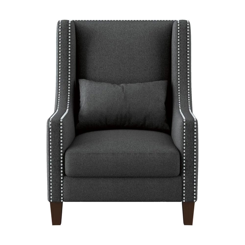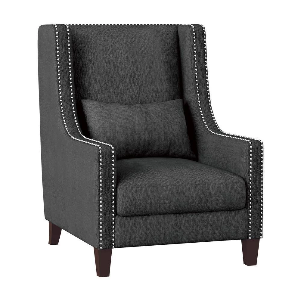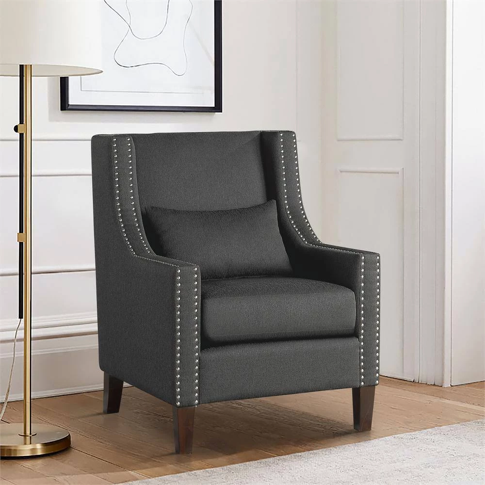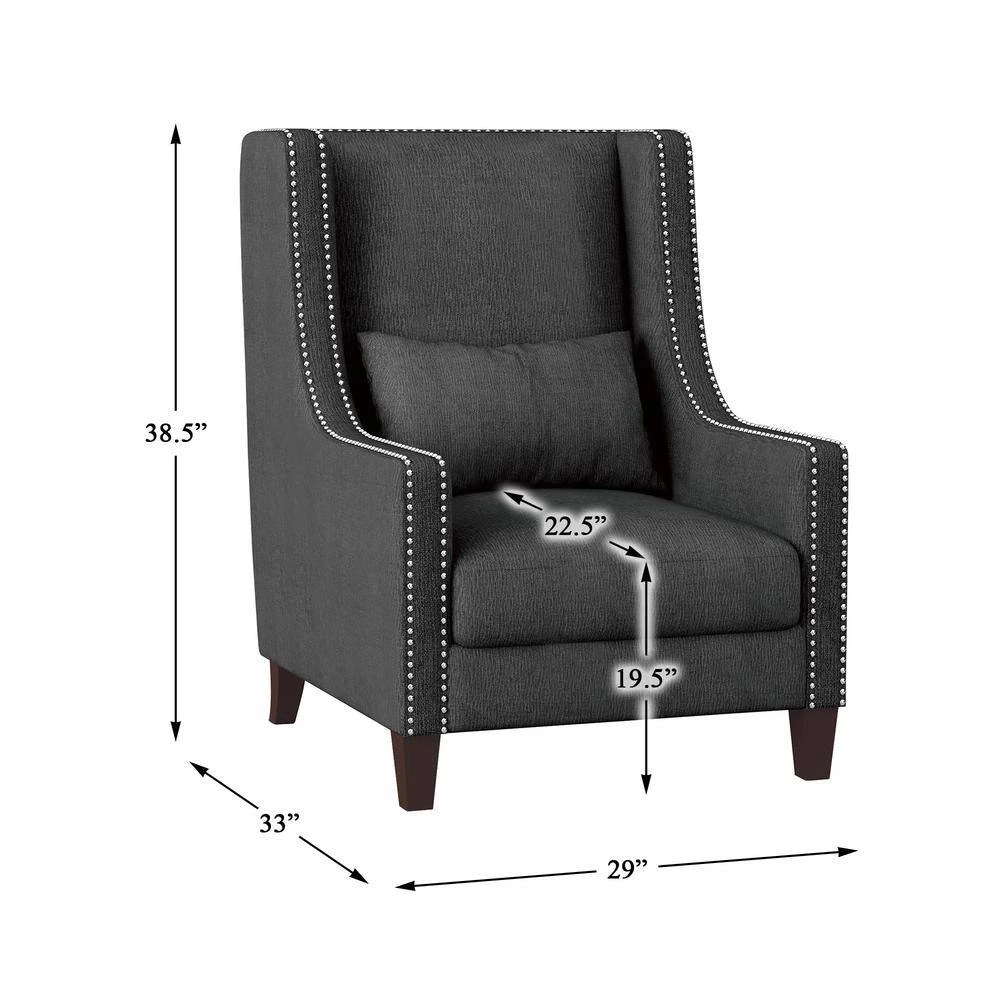 Modern-traditional styling is perfectly executed in the design of the Dorsey Collection. The high-back profile of this elegant accent chair is defined by nailhead trim and its seating is enhanced by the back-supporting kidney pillow. This accent chair is offered in dark gray for versatile placement within your decorative scheme. Also available in light gray.