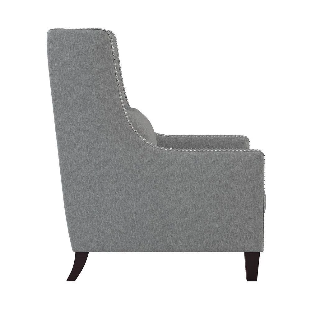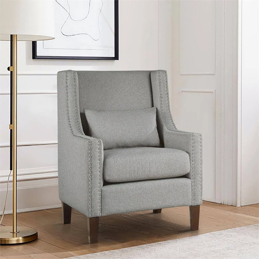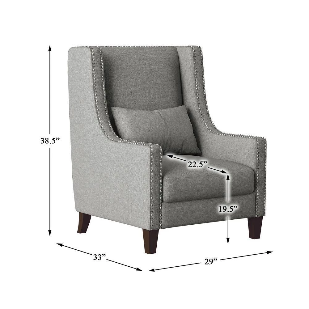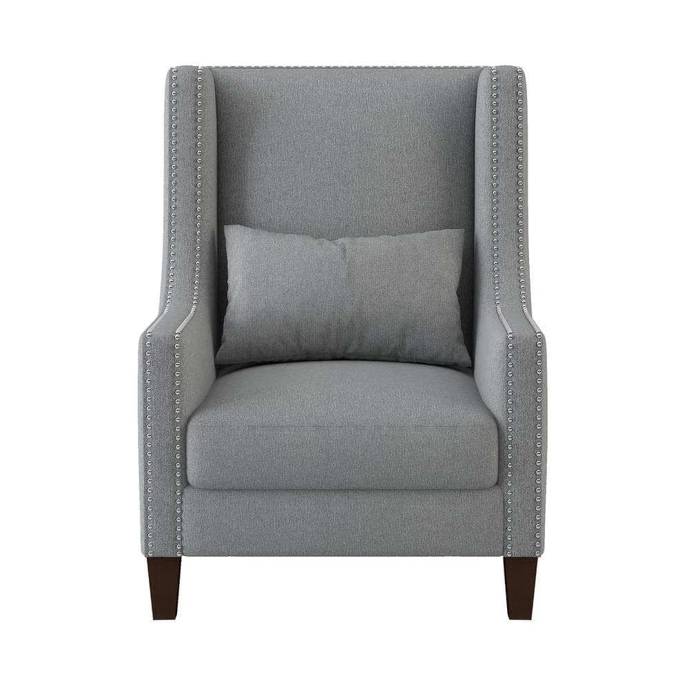 Modern-traditional styling is perfectly executed in the design of the Dorsey Collection. The high-back profile of this elegant accent chair is defined by nailhead trim and its seating is enhanced by the back-supporting kidney pillow. This accent chair is offered in light gray for versatile placement within your decorative scheme. Also available in dark gray.
