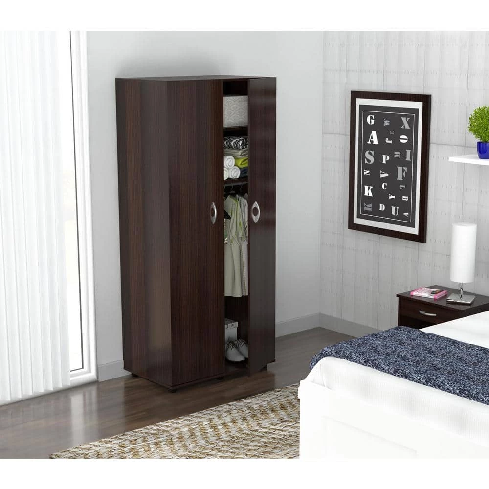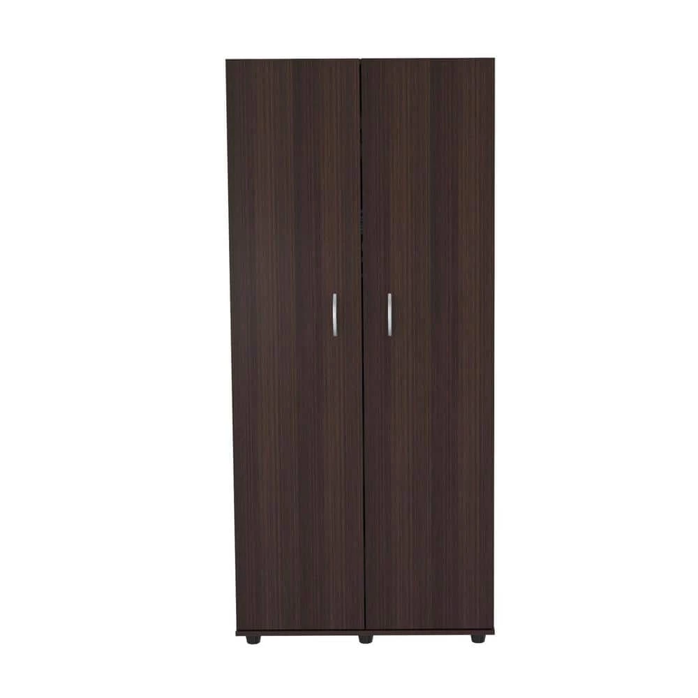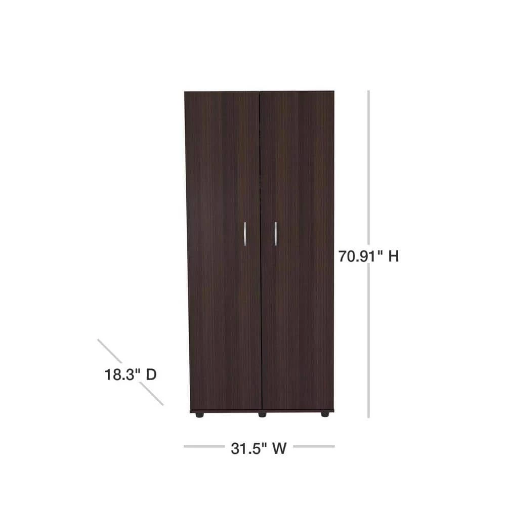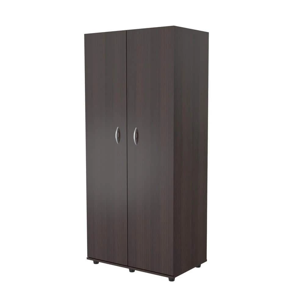 Inval Armoire finished in Espresso-Wengue laminates. Executed in solid composite wood, double laminated durable melamine which is stain, heat and scratch resistant. The unit has a functional design and is an excellent choice for your home or home office. It features 2 doors with brushed chrome metal handles, a hanging bar that provides spacious area for hangers and 2 top shelves for additional storage. The unit sits on four plastic floor gliders for easy repositioning.