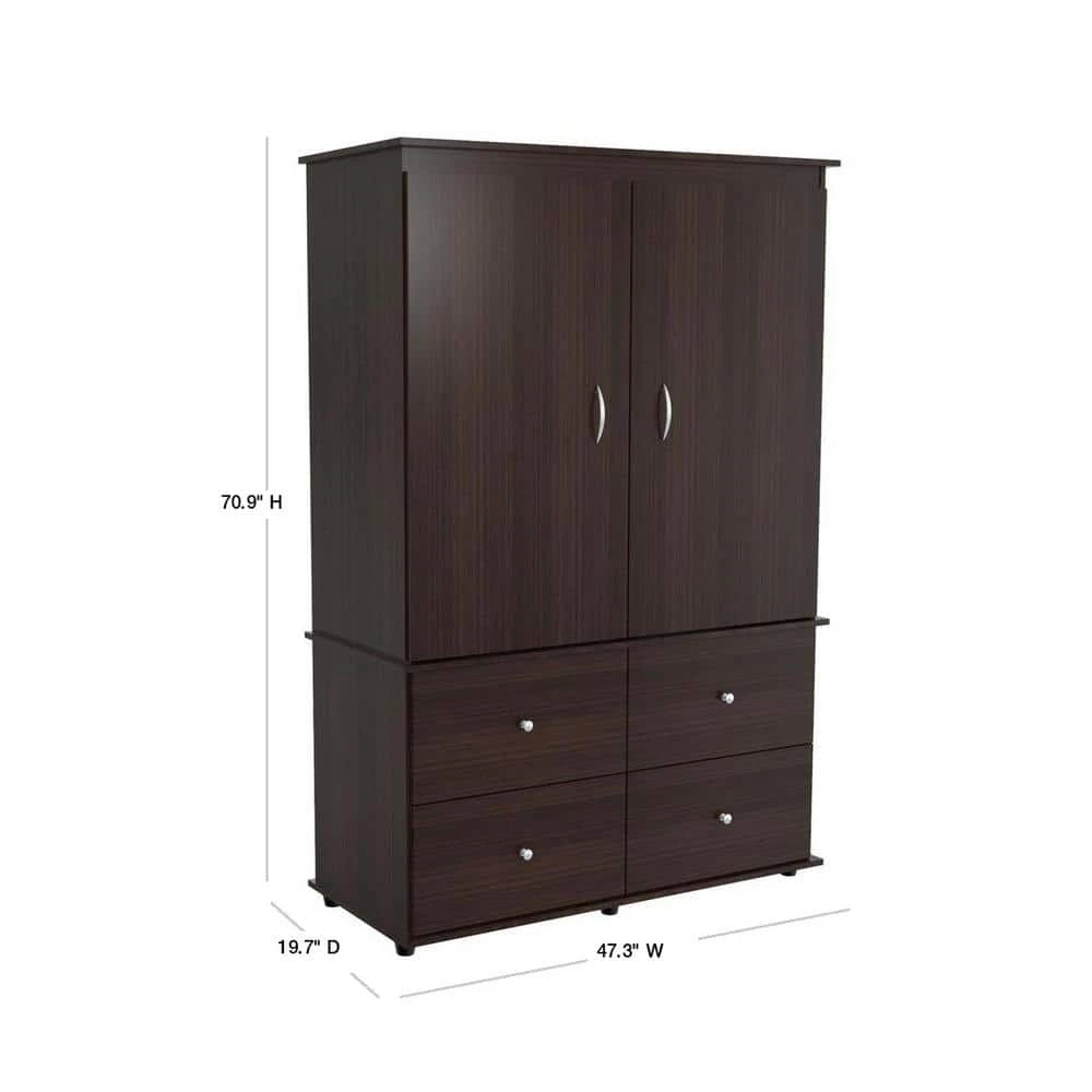 Inval Traditional Armoire/TV Stand/Video AV combination unit finished in Espresso-Wengue laminates. Executed in solid composite wood, double laminated durable melamine which is stain, heat and scratch resistant. The unit features two large doors with brushed steel knobs which conceal a wide hanging bar for use with all your hanging garment needs. With this multi-purpose unit, you can do away with the hanging bar and use as a TV stand which can also be concealed by closing the two large doors when not in use. All this sits above four large bottom doors with brushed metal knobs to provide additional space for all your storage needs.