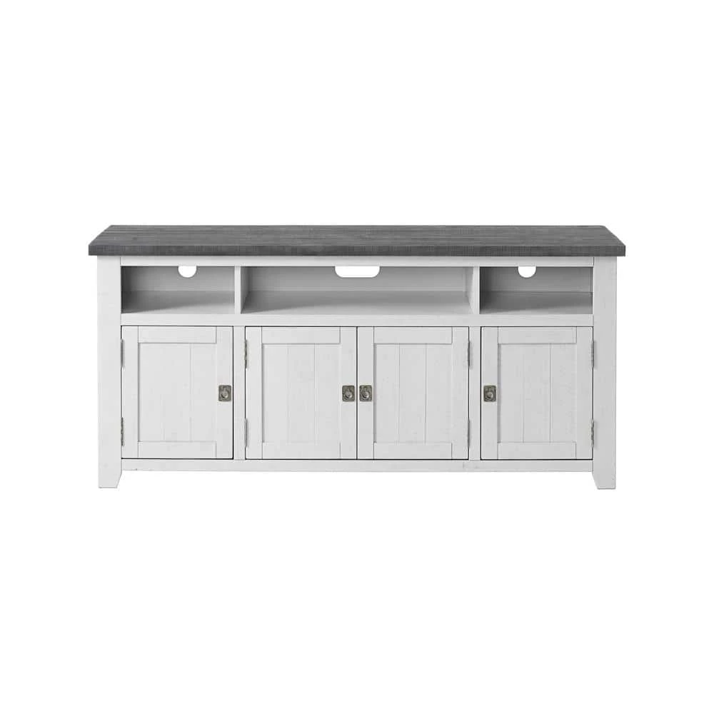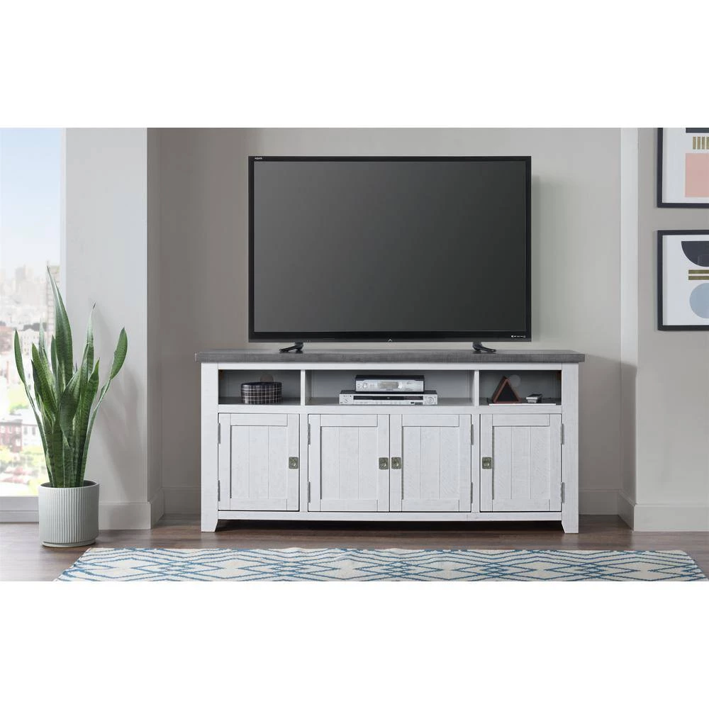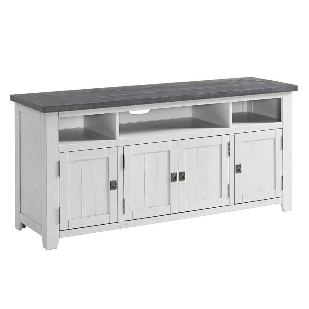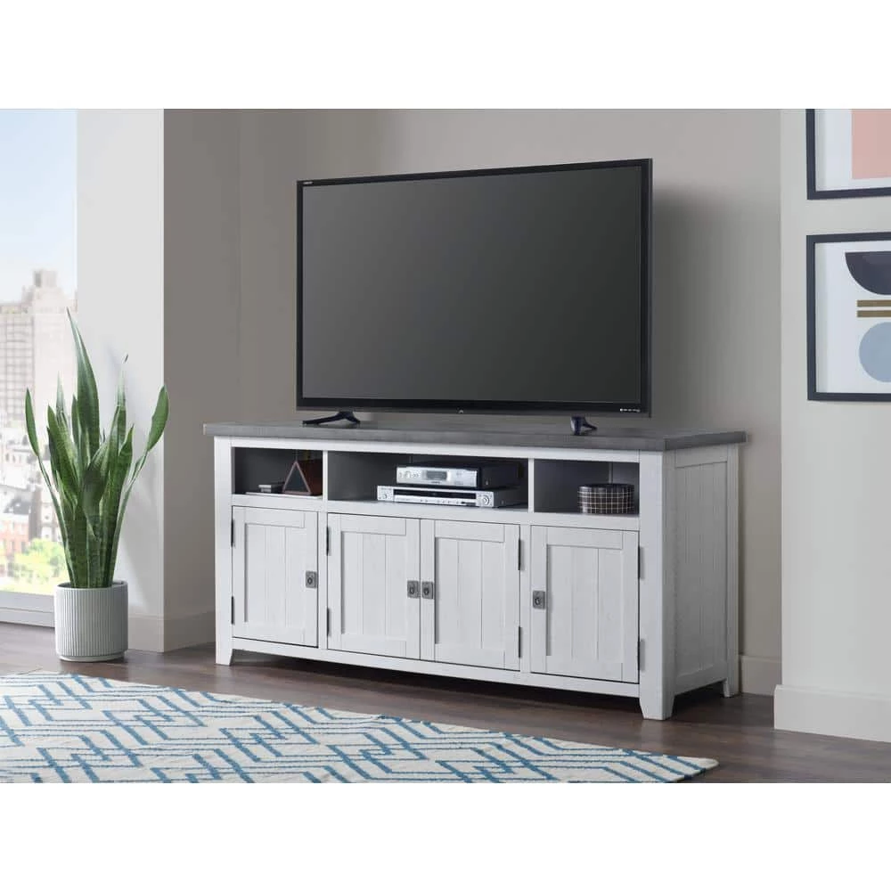 The Foundry TV Stand with its reclaimed lumber look with rough-hewn saw and distress marks fits in perfectly with rustic, farmhouse, and coastal decor. Features the Lightning Fast Assembly System: Easy, quick, and tool less assembly process allows for the TV stand to be assembled in 10 minutes or less. Constructed from solid New Zealand Radiata pine body and mdf back panel. 3 (3) large, open component cubbies allow for plenty of space to store TV, video, audio and video game components. A total of four (4) doors give access to three cabinets, one large middle cabinet and 2 smaller cabinets on each side. Each cabinet features one adjustable and removable shelf along with vertical wire management cutouts. The recessed campaign-style door pulls offer a nice complement to the rustic finish details. Ideal for most TVs up to 70 in. . Assembly Required.