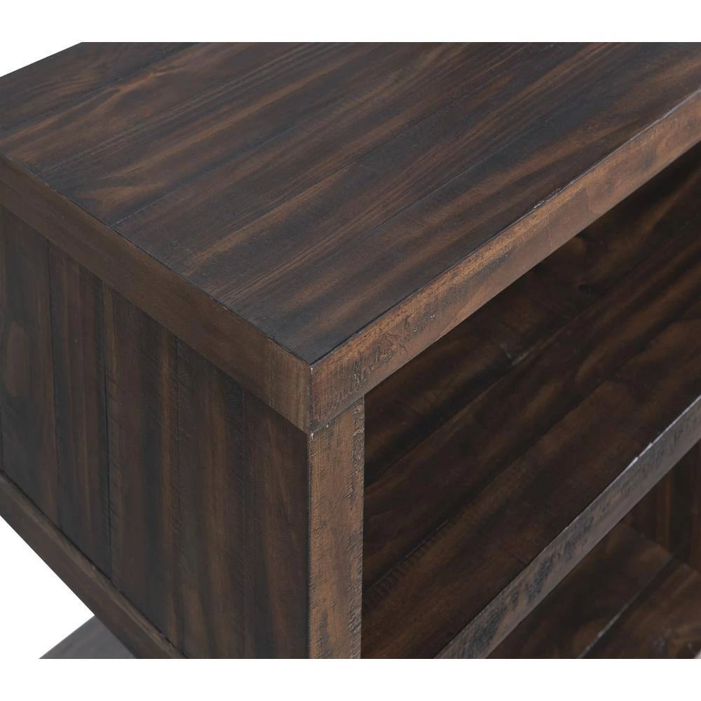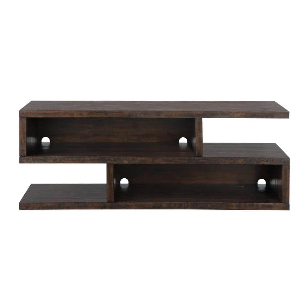 The Lexington 70 in. TV Stand features a cantilevered shelf design that combines both contemporary and rustic looks together. The rustic looks of the TV Stand come from the Dark Mocha finish on solid New Zealand Pine which features circular and bandsaw rough-sawn marks. The freeform style cantilevered shelves bring in the contemporary look while offering plenty of storage space. Both the top and shelves are feature a 2 in. thick top for extra strength and durability. Large cubbies provide two cable management access areas for easy cable management for cable boxes, components, and gaming systems. The expansive design allows for most flat panel TV’s up to 75 in. wide. Easy assembly. Assembled Dimensions: 70 in. W x 26.25 in. H x 17 in. D. Approximate cubby dimensions: Large: 43.5 in. W x 10 in. H x 16.5 in. D; Small: 24.5 in. W x 10 in. H x 17 in. D. Product Materials: solid New Zealand Pine.