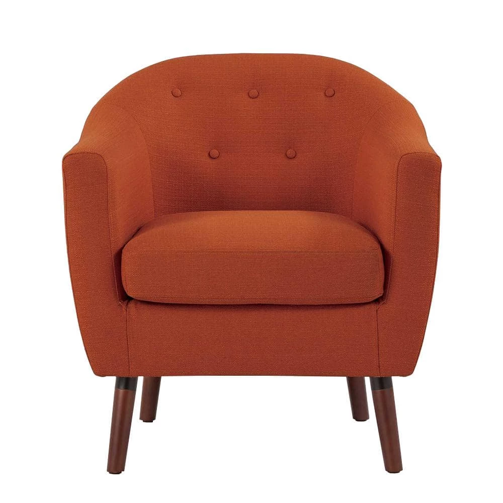 Retro lines need not stay in the past with the mid-century inspired lines of the Lhasa Collection. The fabric chair features a contoured chair back with button-tufted accenting and stylishly appointed cherry finished wood legs, providing a look that shows your classic personal style. Additional fabric offerings of various colors.
