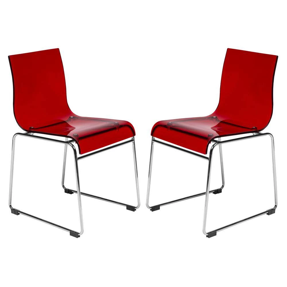 With a chrome-finished steel frame and heavy-duty acrylic seat, these minimalistic chairs are sturdily and dependably built. The seat top is transparent. Included for each chair are four black plastic floor protectors, which also stabilize the chair. However you choose to place the chairs, their simplistic modern feel will instantly enhance the decor of your space. Available in three colors (clear, red and black), mixing and matching colors in one room can lend to a unique and playful environment. As an accent chair, dining chair, or office chair, their versatility is another advantage to this exquisite product of iconic design.