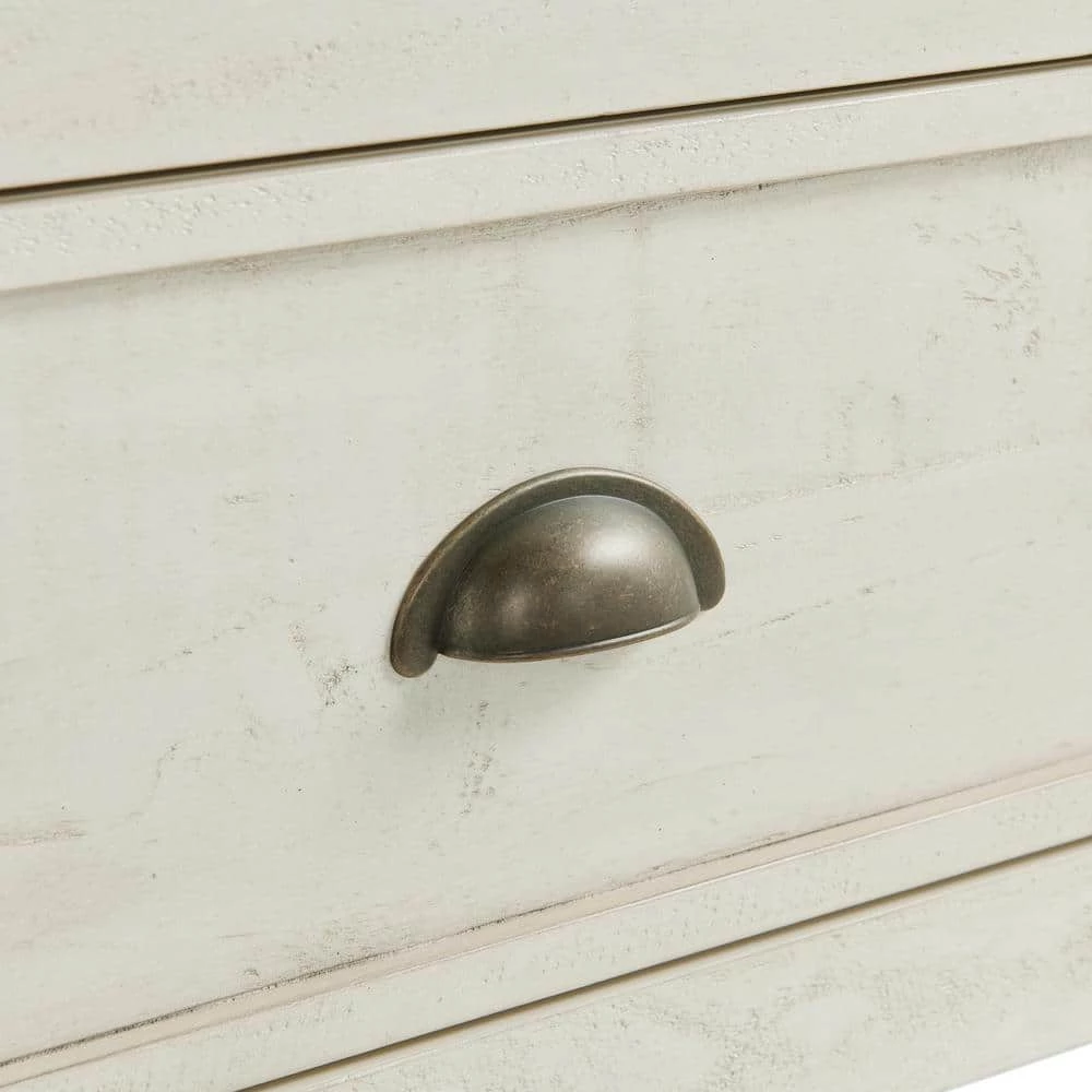 - Farmhouse and coastal inspired design features miter cuts on the top and doors, framed drawer, and antique pewter finished hardware