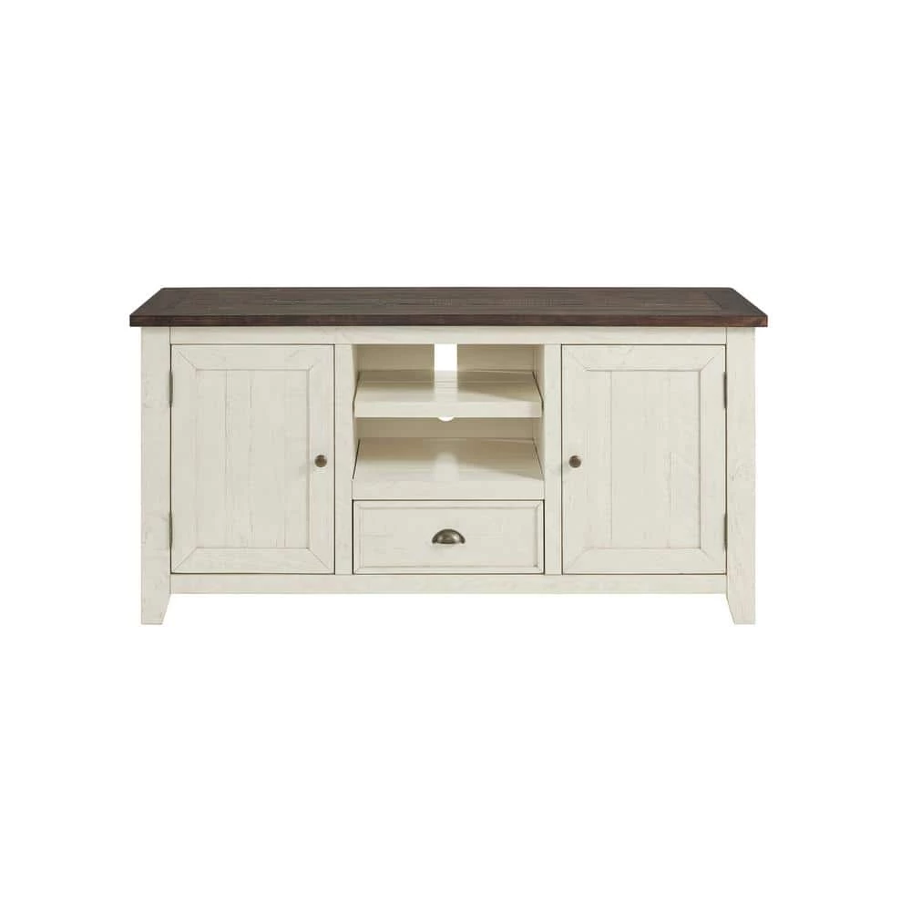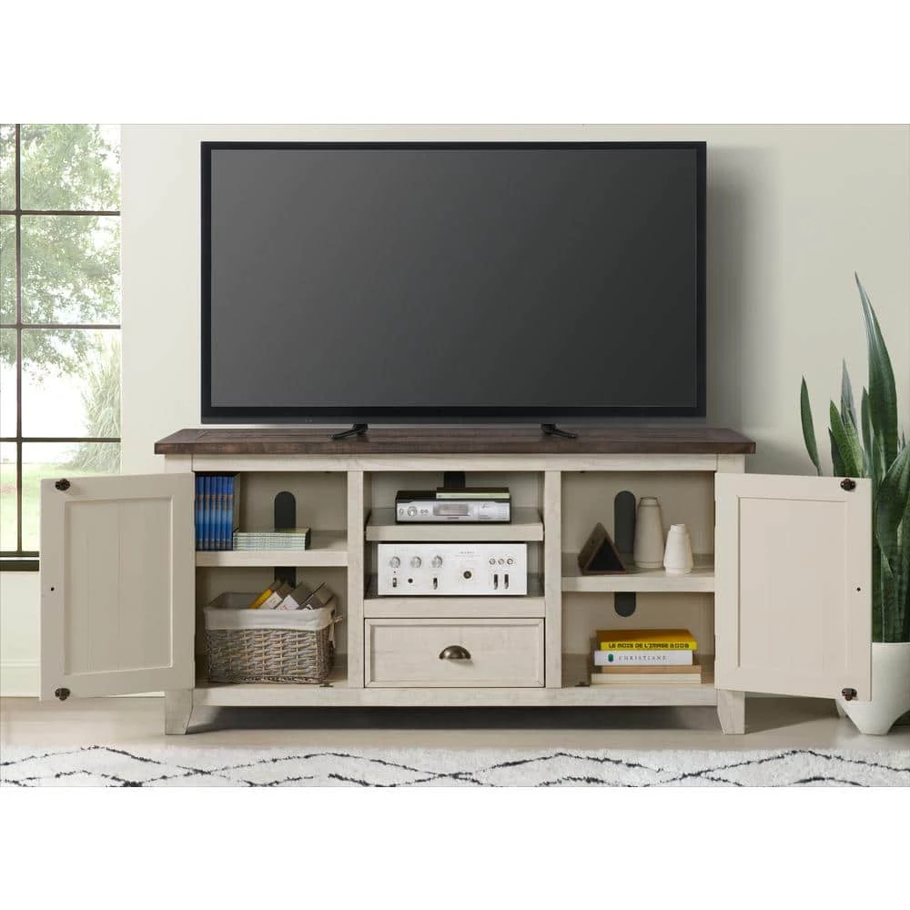 The Monterey 60 in. TV Stand inspired by Coastal and Farmhouse styles and creates fashionable and functional TV Stand. Constructed from solid Pine and finished in a wonderful Black finish with a Brown Top. Two well sized side cabinets with shelves, a large center drawer, and an open cubby with a shelf allows for plenty of storage space and configurations. Antique pewter finished hardware, miter cuts on the top and doors along with a framed drawer adds an extra element of detail to the collection. Features the Lightning Fast Assembly System: Easy, quick, and tool less assembly process allows for the TV stand to be assembled in 10 minutes or less. Vertical cable management cutouts are conveniently provided for optimal airflow for all components. Ideal for most 60 in. flat panel TVs.