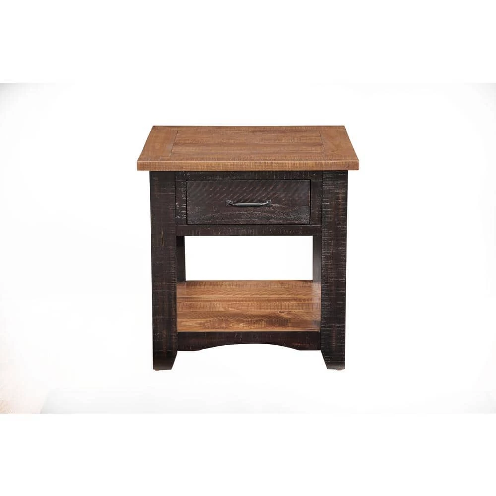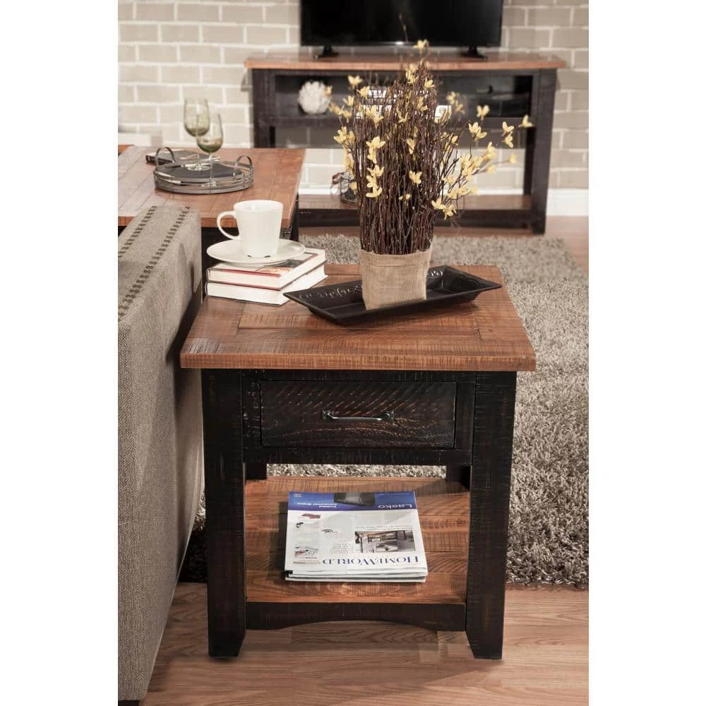 The Rustic Collection End Table is a gorgeous rustic style end table. Constructed of solid pine in an Antique Black and Honey Tobacco finish that offers just the right amount of distressing that can blend easily with other rustic, distressed, warehouse, farmhouse or loft looks. The table features a drawer for storing your goods such as tv controllers, magazines and etc. The hardware is custom finished to complement the tables overall rustic and distressed look. A bottom shelf is offered for additional storage and complemented by curved bottom base moldings. Assembled product dimensions: 24 in. W x 24 in. D x 24 in. H. Product materials: Solid Wood – New Zealand Pine. Easy assembly – Top and drawer unit is pre-assembled, only needing to attach the legs and bottom shelf.