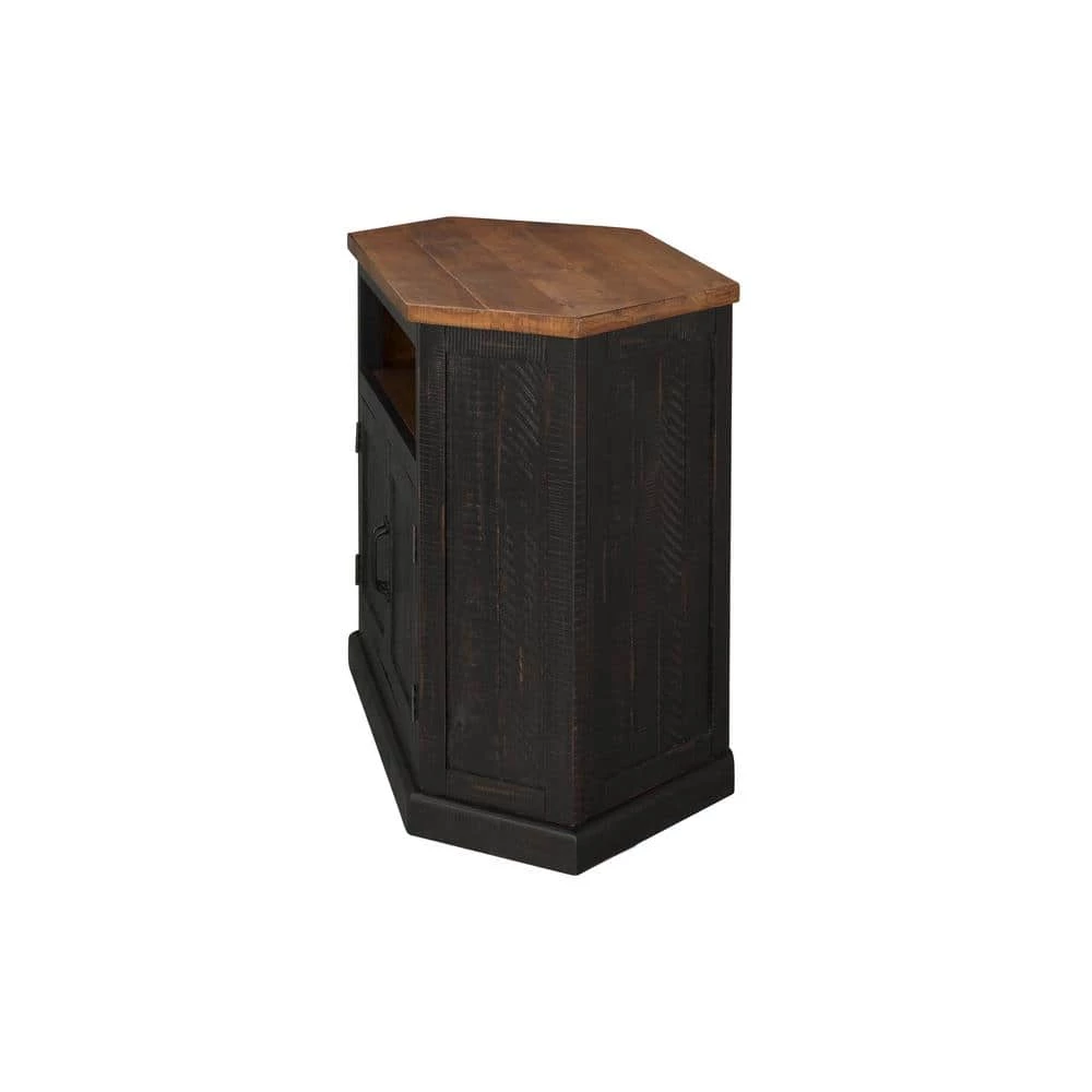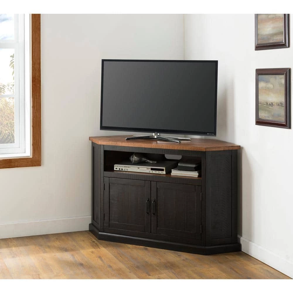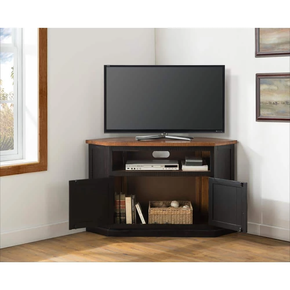 The Rustic Corner TV Stand is designed to maximize space in the living room while not compromising on function and style. Constructed from solid New Zealand Pine with rough sawn details that offers just the right amount of distressing that can blend easily with other rustic, distressed, warehouse, farmhouse or loft looks. An open cubby spans across the TV Stand and offer plenty of room for cable box, gaming systems, or a sound bar. The large cabinet design provides for versatile storage options for additional audio, video, gaming components, or other belongings. Ideal for flat panel TVs up to 55. Custom finished black hardware. Features the Lightning Fast Assembly System which allows for easy and fast assembly.