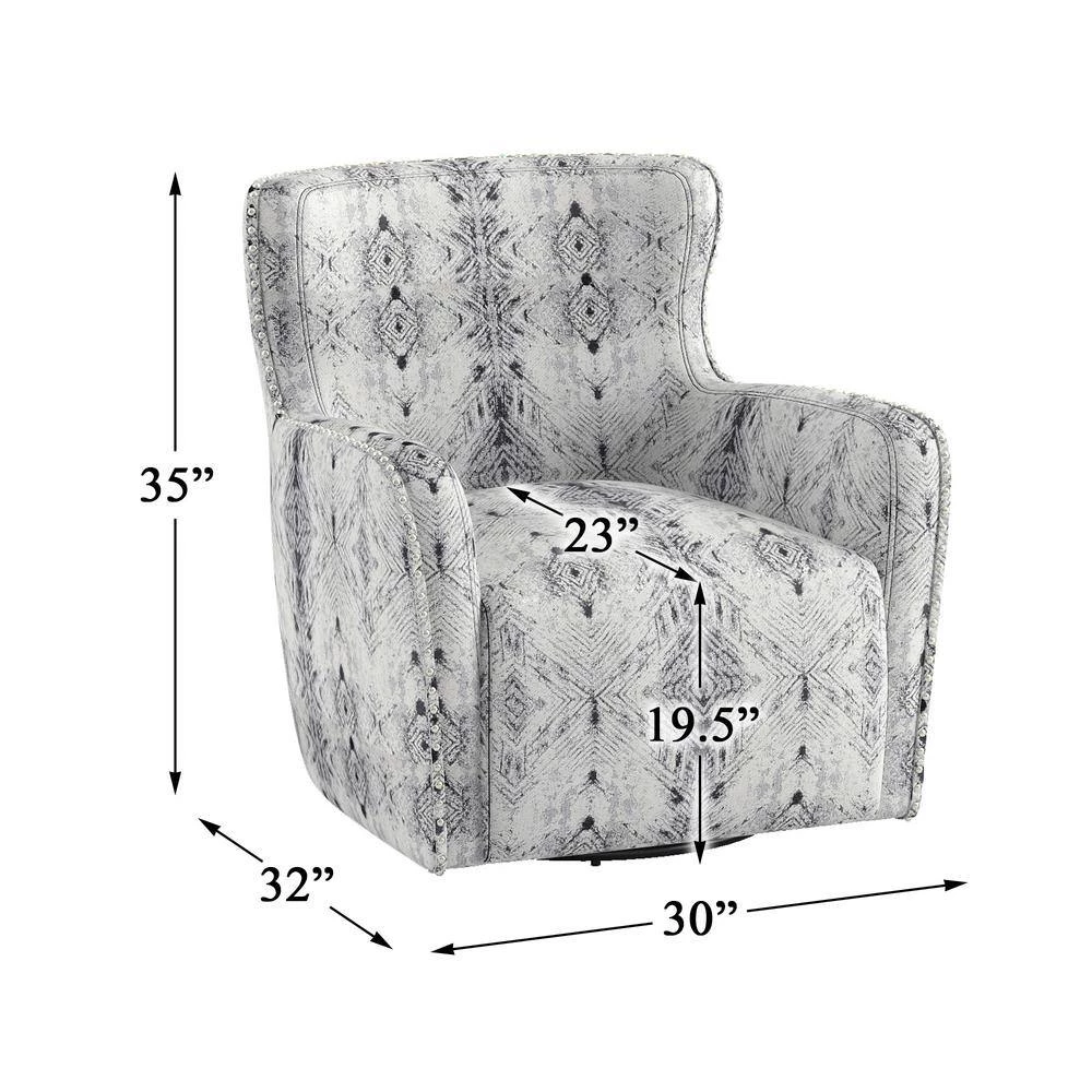 Comfortable and contemporary, this Vega armchair offers both style and comfort. Contoured arms provide visual flow to the chair’s pattern while nailhead trim defines the profile of the vega collection. The bold multi-tonal ash coloring of the printed chenille lends a distinct accent to your home’s decor. The chair has a full rotation swivel base that allows you full visual access to your space with a gentle turn.